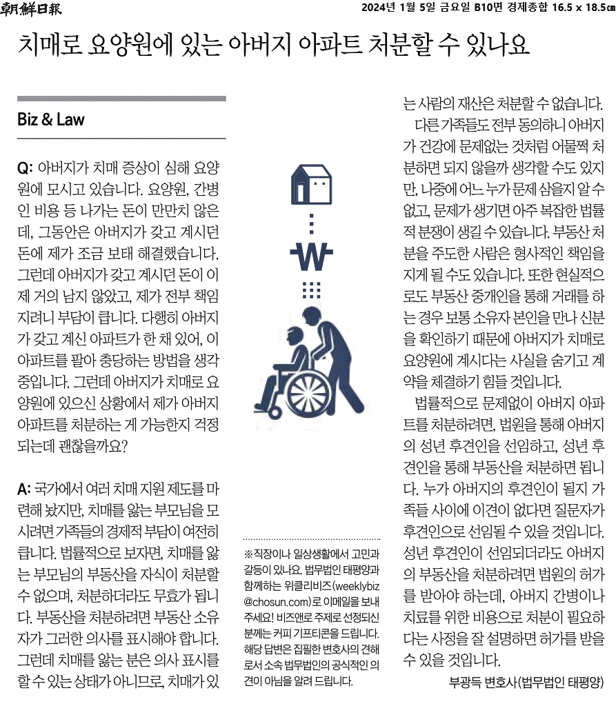 ② 법률적으로 보면, 치매를 앓는 부모님의 부동산을 자식이 처분할 수 없으며, 처분하더라도 무효가 됩니다.