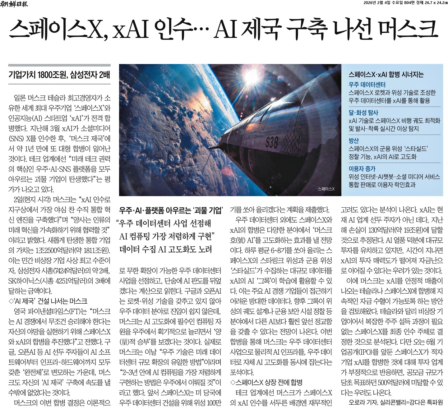 ② 2일(현지 시각) 머스크는 “xAI 인수로 지구상에서 가장 야심 찬 수직 통합 혁신 엔진을 구축했다”며 “양사는 인류의 미래 혁신을 가속화하기 위해 협력할 것”이라고 밝혔다. 새롭게 탄생한 통합 기업의 가치는 1조2500억달러(약 1811조원). 이는 민간 비상장 기업 사상 최고 수준이자, 삼성전자 시총(7424억달러)의 약 2배, SK하이닉스(시총 4251억달러)의 3배에 달하는 금액이다.