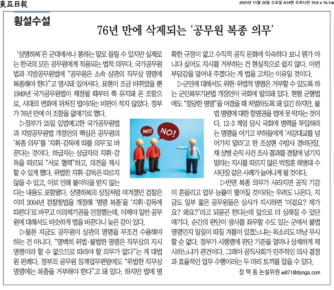① ‘상명하복’은 군대에서나 통하는 말로 들릴 수 있지만 실제로는 한국의 모든 공무원에게 적용되는 법적 의무다. 국가공무원법과 지방공무원법에 “공무원은 소속 상관의 직무상 명령에 복종해야 한다”고 명시돼 있어서다. 표현이 조금 바뀌었을 뿐 1949년 국가공무원법이 제정될 때부터 쭉 유지돼 온 조항으로, 시대의 변화에 뒤처진 법이라는 비판이 적지 않았다. 정부가 76년 만에 이 조항을 없애기로 했다.
