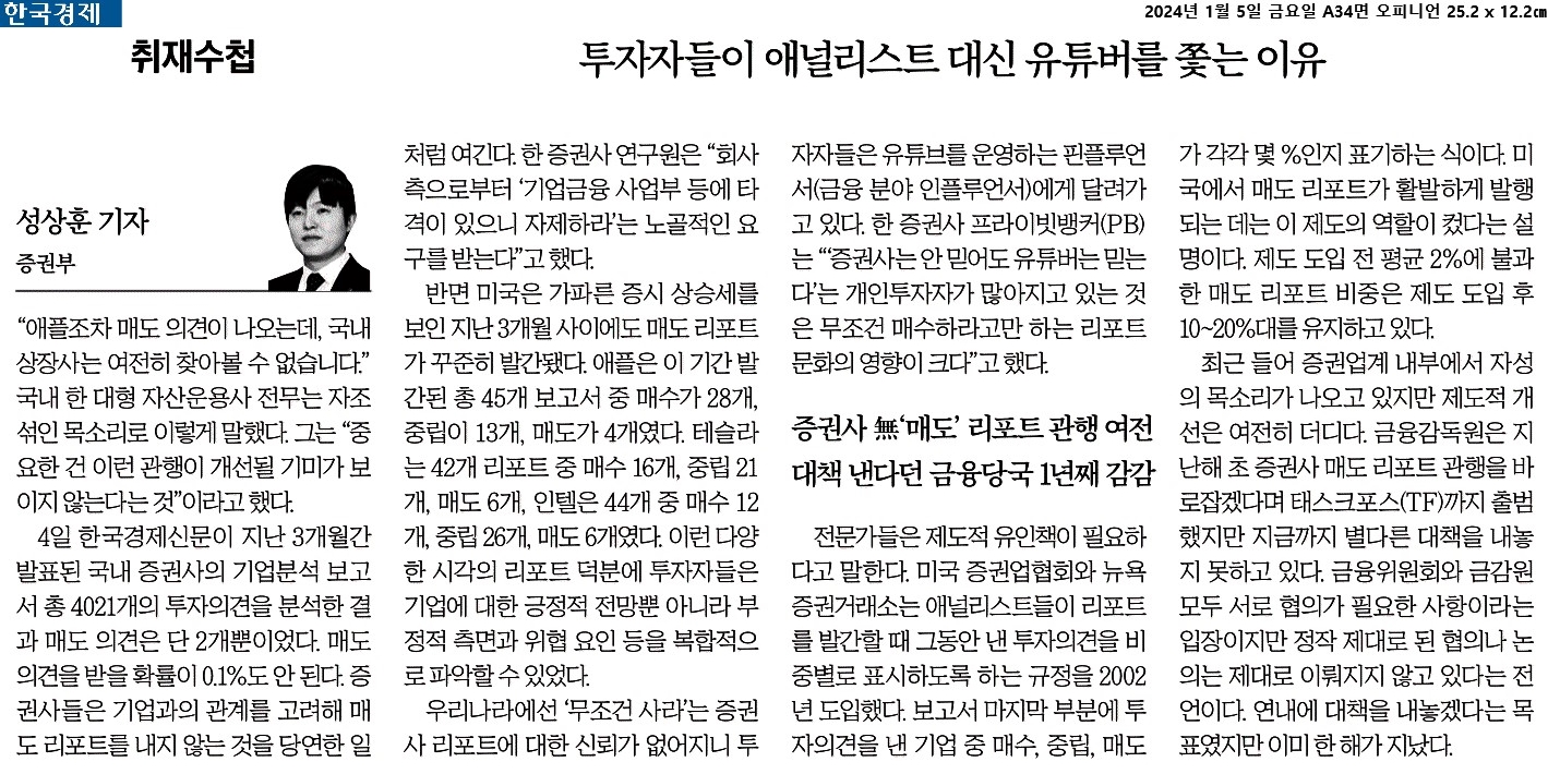 ④ 우리나라에선 '무조건 사라'는 증권사 리포트에 대한 신뢰가 없어지니 투자자들은 유튜브를 운영하는 핀플루언서(금융 분야 인플루언서)에게 달려가고 있다.