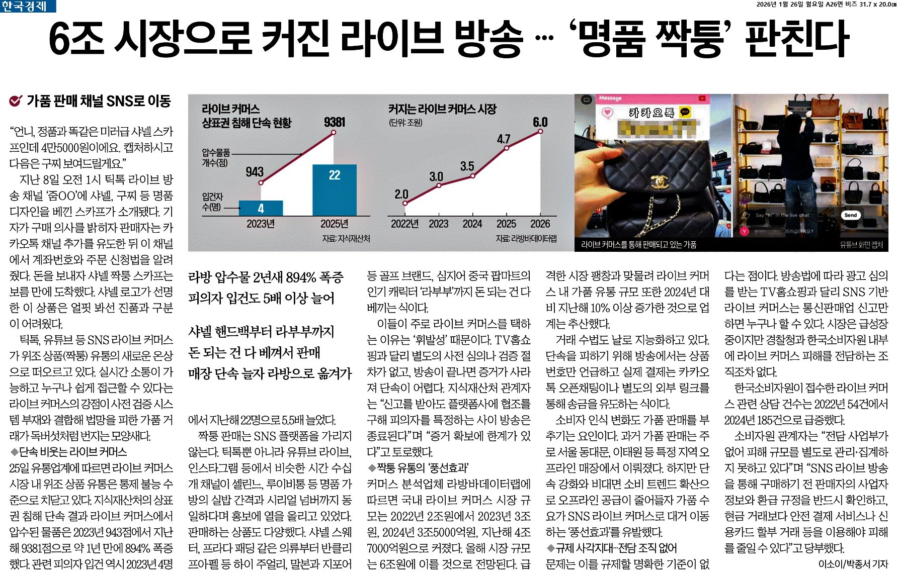 ① 틱톡, 유튜브 등 SNS 라이브 커머스가 위조 상품(짝퉁) 유통의 새로운 온상으로 떠오르고 있다. 실시간 소통이 가능하고 누구나 쉽게 접근할 수 있다는 라이브 커머스의 강점이 사전 검증 시스템 부재와 결합해 법망을 피한 가품 거래가 독버섯처럼 번지는 모양새다.