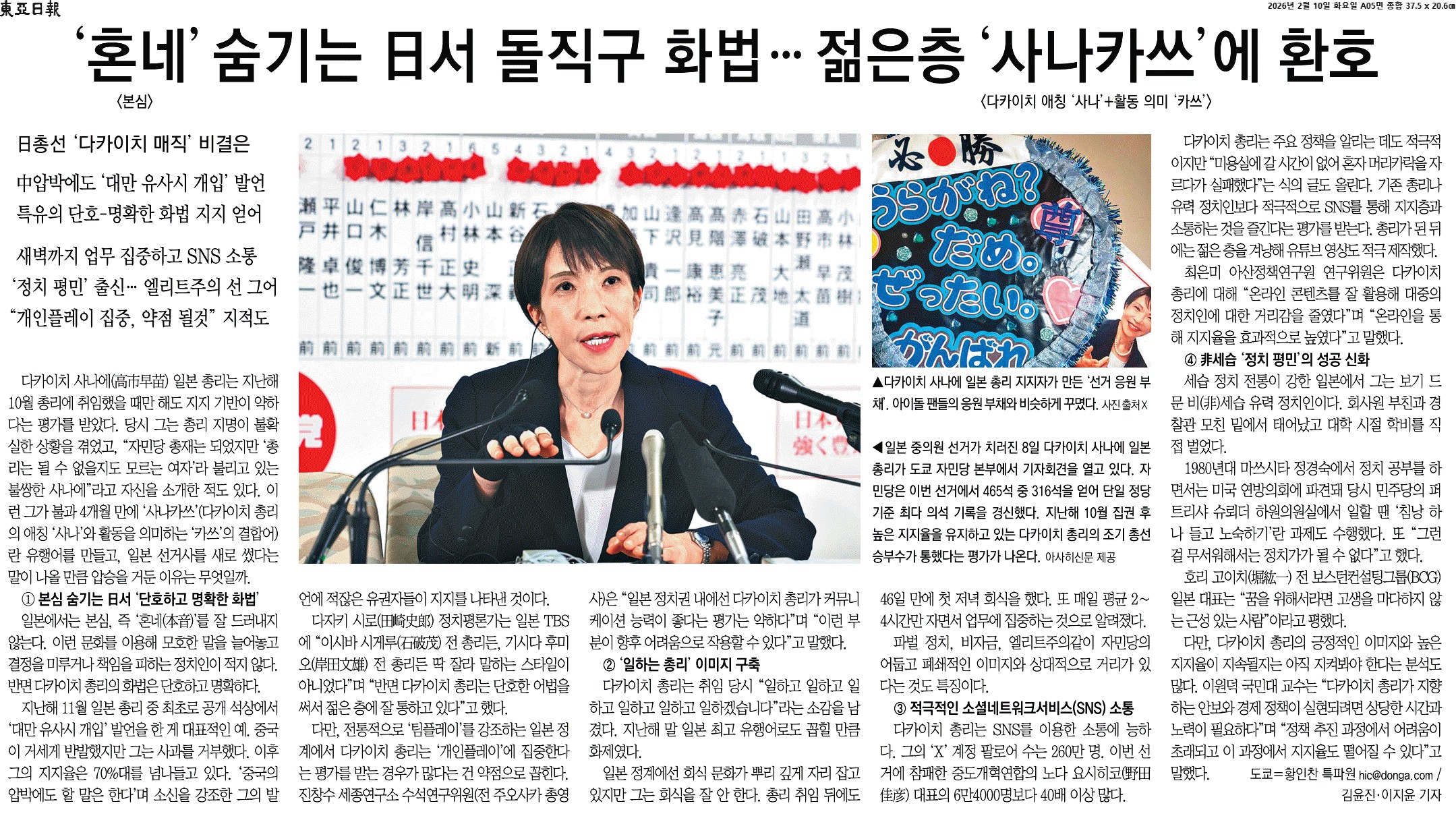 ① 다카이치 사나에(高市早苗) 일본 총리는 지난해 10월 총리에 취임했을 때만 해도 지지 기반이 약하다는 평가를 받았다. 당시 그는 총리 지명이 불확실한 상황을 겪었고, “자민당 총재는 되었지만 ‘총리는 될 수 없을지도 모르는 여자’라 불리고 있는 불쌍한 사나에”라고 자신을 소개한 적도 있다. 이런 그가 불과 4개월 만에 ‘사나카쓰’(다카이치 총리의 애칭 ‘사나’와 활동을 의미하는 ‘카쓰’의 결합어)란 유행어를 만들고, 일본 선거사를 새로 썼다는 말이 나올 만큼 압승을 거둔 이유는 무엇일까.