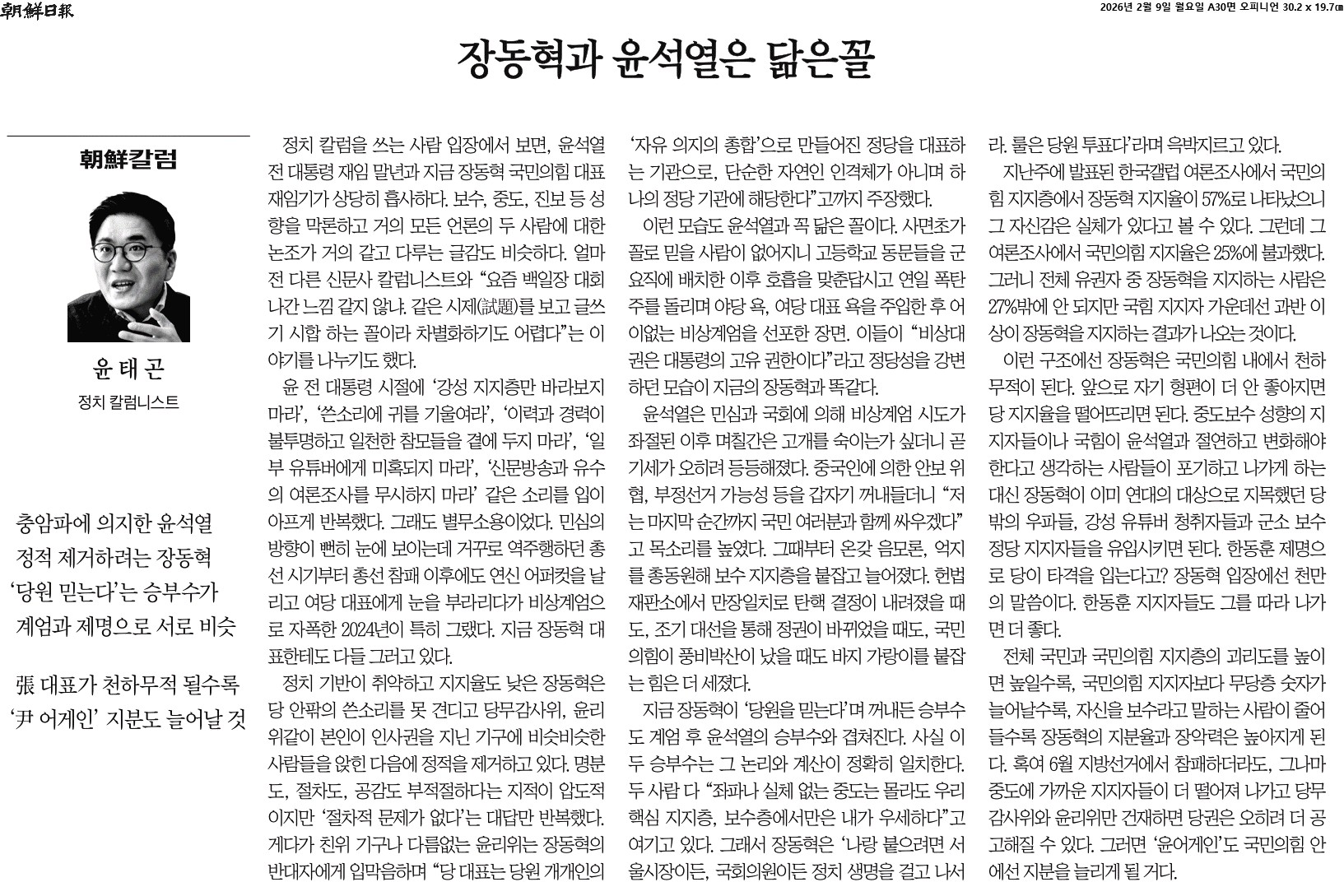 ① 정치 칼럼을 쓰는 사람 입장에서 보면, 윤석열 전 대통령 재임 말년과 지금 장동혁 국민의힘 대표 재임기가 상당히 흡사하다. 보수, 중도, 진보 등 성향을 막론하고 거의 모든 언론의 두 사람에 대한 논조가 거의 같고 다루는 글감도 비슷하다. 얼마 전 다른 신문사 칼럼니스트와 “요즘 백일장 대회 나간 느낌 같지 않냐. 같은 시제(試題)를 보고 글쓰기 시합 하는 꼴이라 차별화하기도 어렵다”는 이야기를 나누기도 했다.