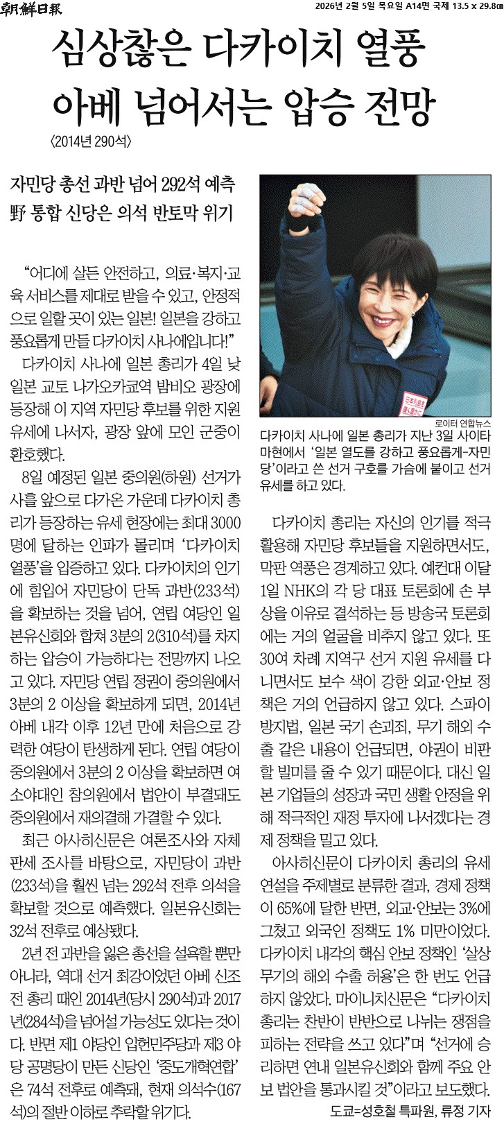 ② 8일 예정된 일본 중의원(하원) 선거가 사흘 앞으로 다가온 가운데 다카이치 총리가 등장하는 유세 현장에는 최대 3000명에 달하는 인파가 몰리며 ‘다카이치 열풍’을 입증하고 있다. 다카이치의 인기에 힘입어 자민당이 단독 과반(233석)을 확보하는 것을 넘어, 연립 여당인 일본유신회와 합쳐 3분의 2(310석)를 차지하는 압승이 가능하다는 전망까지 나오고 있다.