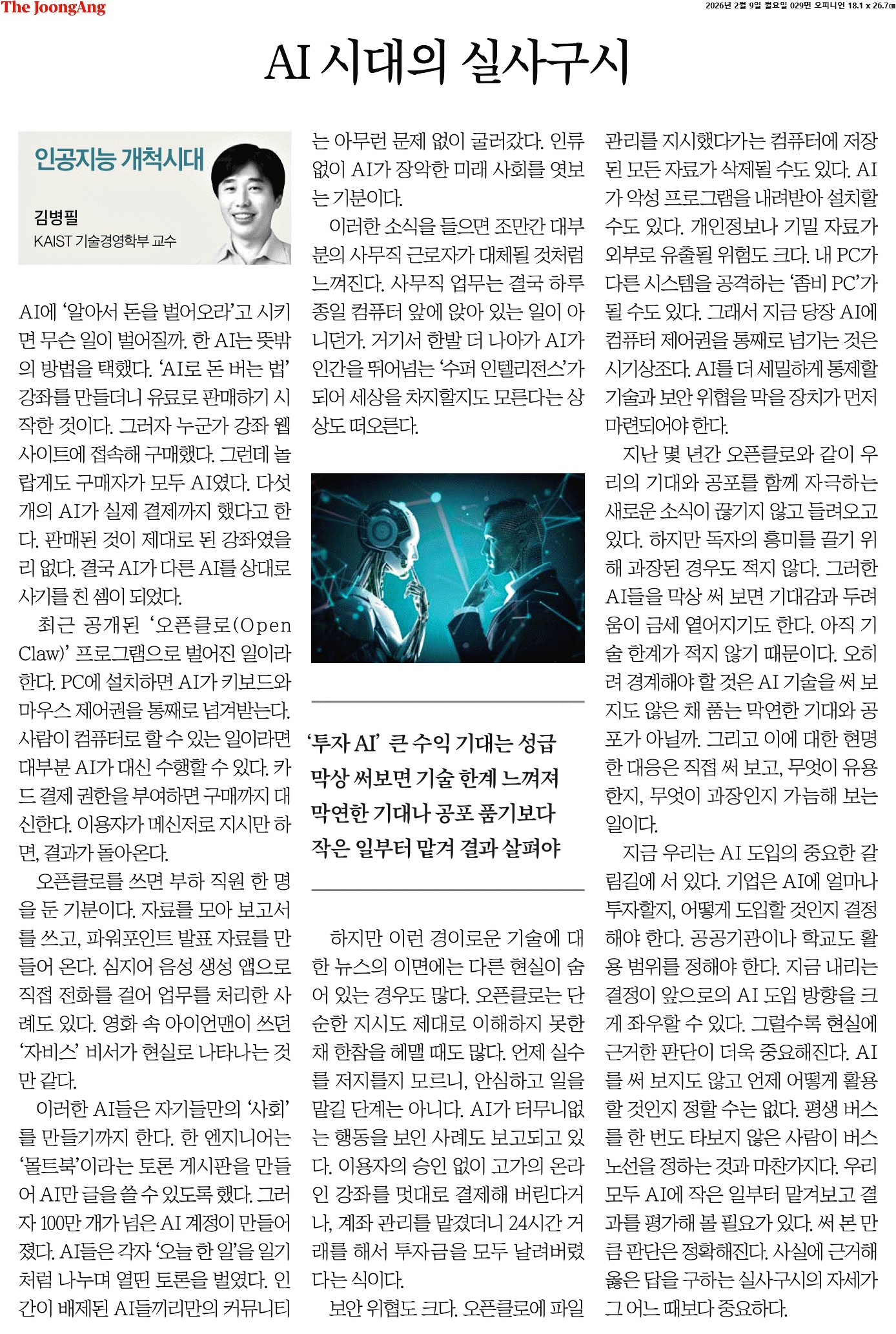 ④ 지난 몇 년간 오픈클로와 같이 우리의 기대와 공포를 함께 자극하는 새로운 소식이 끊기지 않고 들려오고 있다. 하지만 독자의 흥미를 끌기 위해 과장된 경우도 적지 않다. 그러한 AI들을 막상 써 보면 기대감과 두려움이 금세 옅어지기도 한다. 아직 기술 한계가 적지 않기 때문이다. 오히려 경계해야 할 것은 AI 기술을 써 보지도 않은 채 품는 막연한 기대와 공포가 아닐까. 그리고 이에 대한 현명한 대응은 직접 써 보고, 무엇이 유용한지, 무엇이 과장인지 가늠해 보는 일이다.