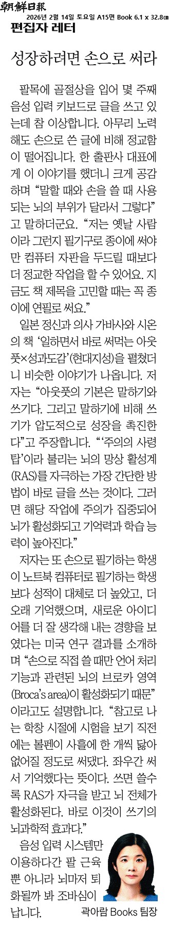 ② 일본 정신과 의사 가바사와 시온의 책 ‘일하면서 바로 써먹는 아웃풋×성과도감’(현대지성)을 펼쳤더니 비슷한 이야기가 나옵니다. 저자는 “아웃풋의 기본은 말하기와 쓰기다. 그리고 말하기에 비해 쓰기가 압도적으로 성장을 촉진한다”고 주장합니다. “‘주의의 사령탑’이라 불리는 뇌의 망상 활성계(RAS)를 자극하는 가장 간단한 방법이 바로 글을 쓰는 것이다. 그러면 해당 작업에 주의가 집중되어 뇌가 활성화되고 기억력과 학습 능력이 높아진다.”