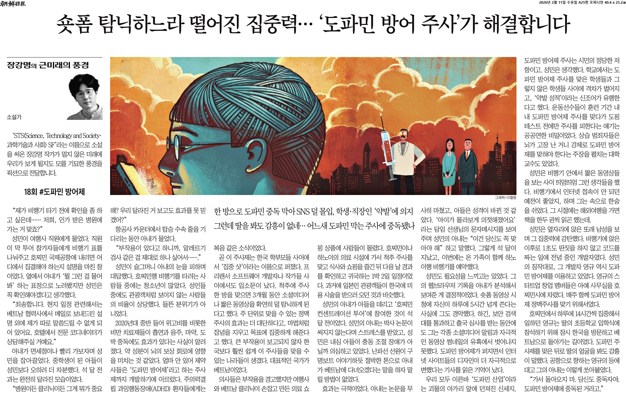 ③ 곧 이 주사제는 한국 학부모들 사이에서 ‘집중 샷’이라는 이름으로 퍼졌다. 프리랜서 소프트웨어 개발자나 작가들 사이에서도 입소문이 났다. 척추에 주사 한 방을 맞으면 3개월 동안 소셜미디어나 짧은 동영상을 확연히 덜 탐닉하게 된다고 했다. 주 단위로 맞을 수 있는 정맥 주사의 효과는 더 대단하다고, 마법처럼 잡념을 지우고 목표에 집중하게 해준다고 했다. 큰 부작용이 보고되지 않자 한국보다 훨씬 쉽게 이 주사들을 맞을 수 있는 나라들이 생겼다. 대표적인 국가가 베트남이었다.