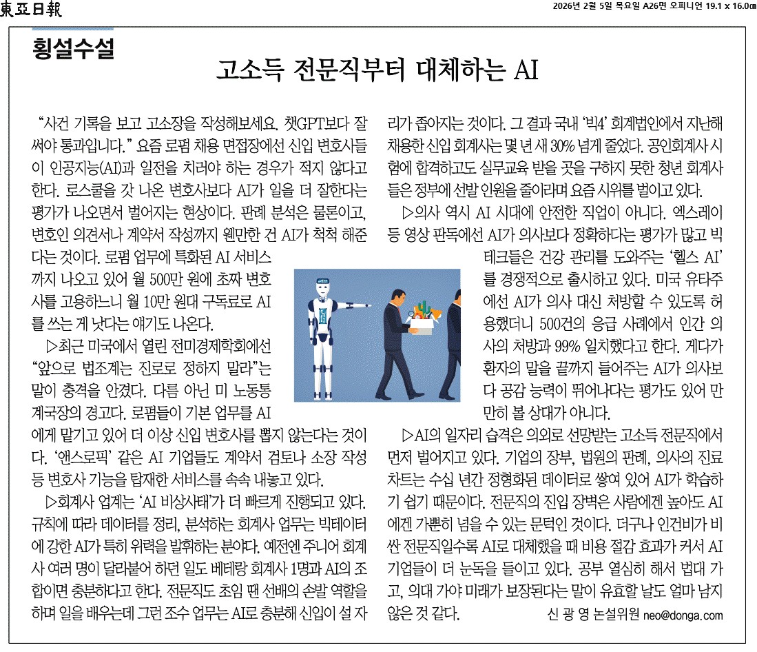 ⑤ AI의 일자리 습격은 의외로 선망받는 고소득 전문직에서 먼저 벌어지고 있다. 기업의 장부, 법원의 판례, 의사의 진료 차트는 수십 년간 정형화된 데이터로 쌓여 있어 AI가 학습하기 쉽기 때문이다. 전문직의 진입 장벽은 사람에겐 높아도 AI에겐 가뿐히 넘을 수 있는 문턱인 것이다. 더구나 인건비가 비싼 전문직일수록 AI로 대체했을 때 비용 절감 효과가 커서 AI 기업들이 더 눈독을 들이고 있다. 공부 열심히 해서 법대 가고, 의대 가야 미래가 보장된다는 말이 유효할 날도 얼마 남지 않은 것 같다.
