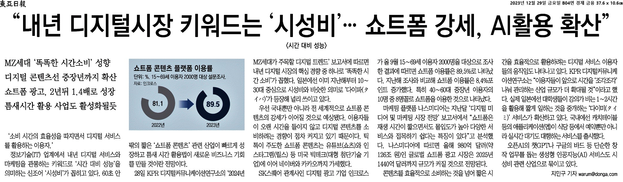 ⑤ 트렌드코리아2024 에서 나왔던 키워드 "분초사회"가 "시성비" 와 맥락을 같이 하는 흐름.