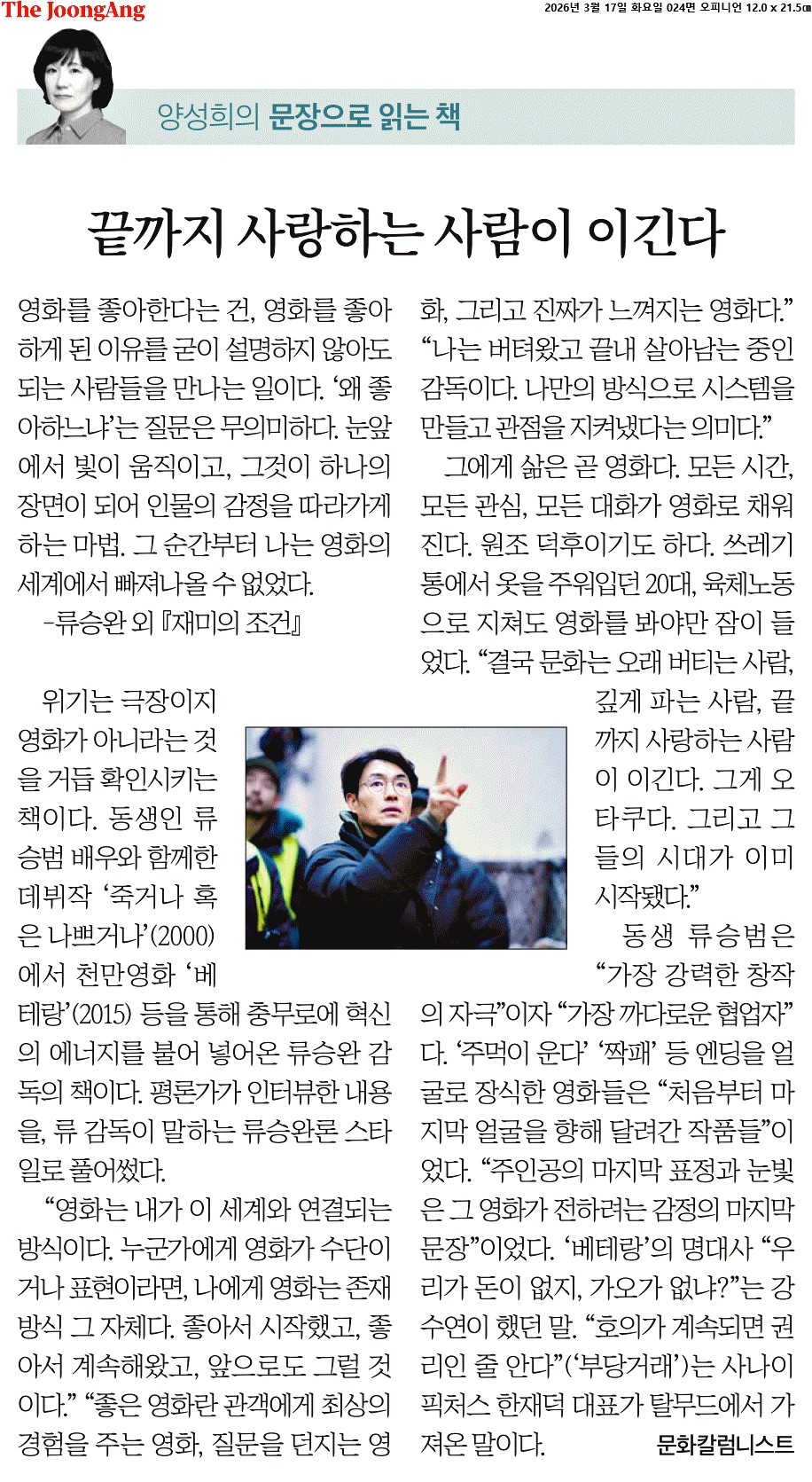 ② 위기는 극장이지 영화가 아니라는 것을 거듭 확인시키는 책이다. 동생인 류승범 배우와 함께한 데뷔작 ‘죽거나 혹은 나쁘거나’(2000)에서 천만영화 ‘베테랑’(2015) 등을 통해 충무로에 혁신의 에너지를 불어 넣어온 류승완 감독의 책이다. 평론가가 인터뷰한 내용을, 류 감독이 말하는 류승완론 스타일로 풀어썼다.