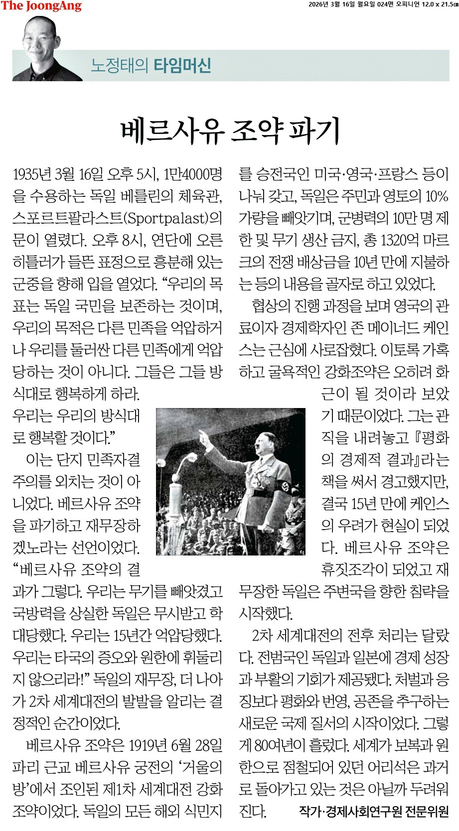 ④ 협상의 진행 과정을 보며 영국의 관료이자 경제학자인 존 메이너드 케인스는 근심에 사로잡혔다. 이토록 가혹하고 굴욕적인 강화조약은 오히려 화근이 될 것이라 보았기 때문이었다. 그는 관직을 내려놓고 『평화의 경제적 결과』라는 책을 써서 경고했지만, 결국 15년 만에 케인스의 우려가 현실이 되었다. 베르사유 조약은 휴짓조각이 되었고 재무장한 독일은 주변국을 향한 침략을 시작했다.
