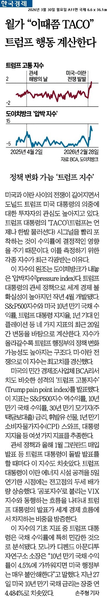 ① 미국과 이란 사이의 전쟁이 길어지면서 도널드 트럼프 미국 대통령의 의중에 대한 투자자의 관심도 높아지고 있다. 트럼프 대통령의 ‘TACO’(트럼프는 언제나 한발 물러선다) 시그널을 빨리 포착하는 것이 수익률에 결정적인 영향을 주기 때문이다.