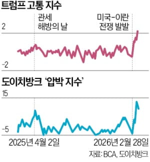 ② 이 지수의 원조는 도이체방크가 내놓은 ‘압박지수’(pressure index)다. 트럼프 대통령의 관세 정책으로 세계 경제 불확실성이 높아지던 작년 4월 개발됐다. S&P500지수와 미국 10년 만기 국채 수익률, 트럼프 대통령 지지율, 1년 기대 인플레이션 등 네 가지 지표의 최근 20일간 변동을 바탕으로 계산한다. 지수가 올라갈수록 트럼프 행정부의 정책 변화 가능성도 높아지는 구조다.
