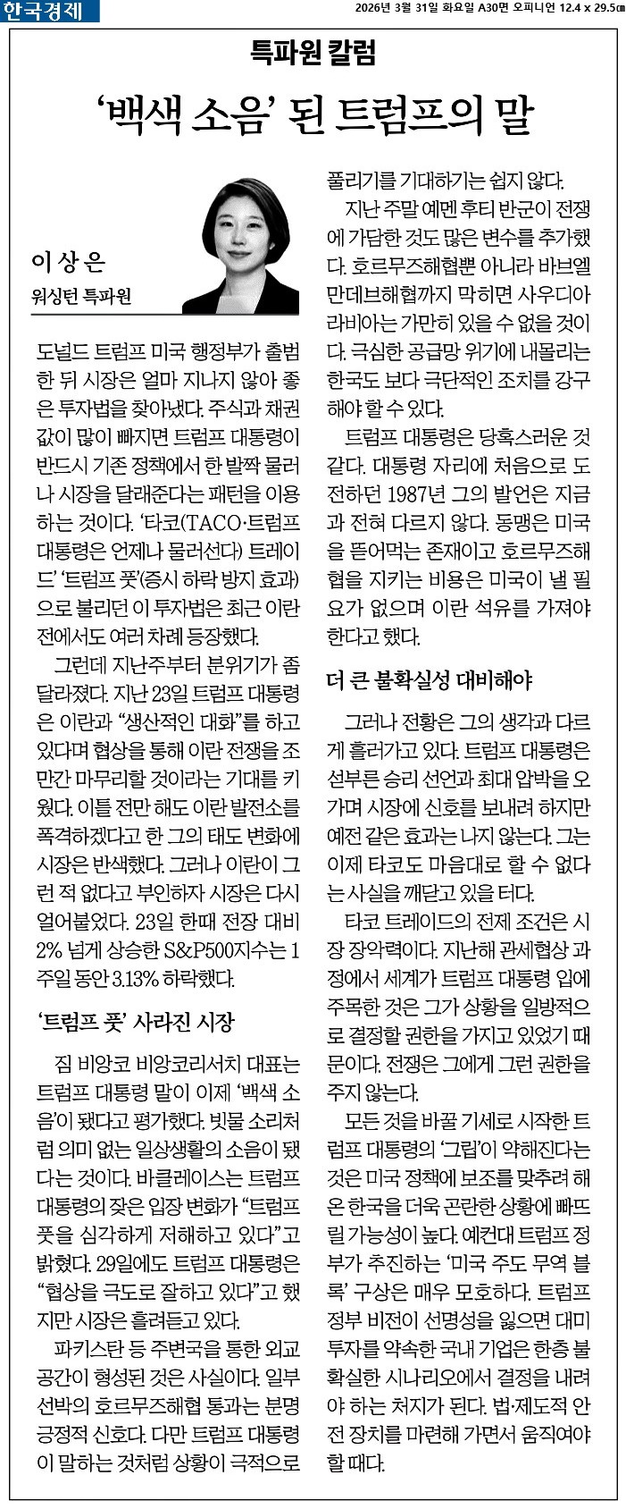 | 월가 "이때쯤 TACO" 트럼프 행동 계산한다 (0) | 2026.04.01 |