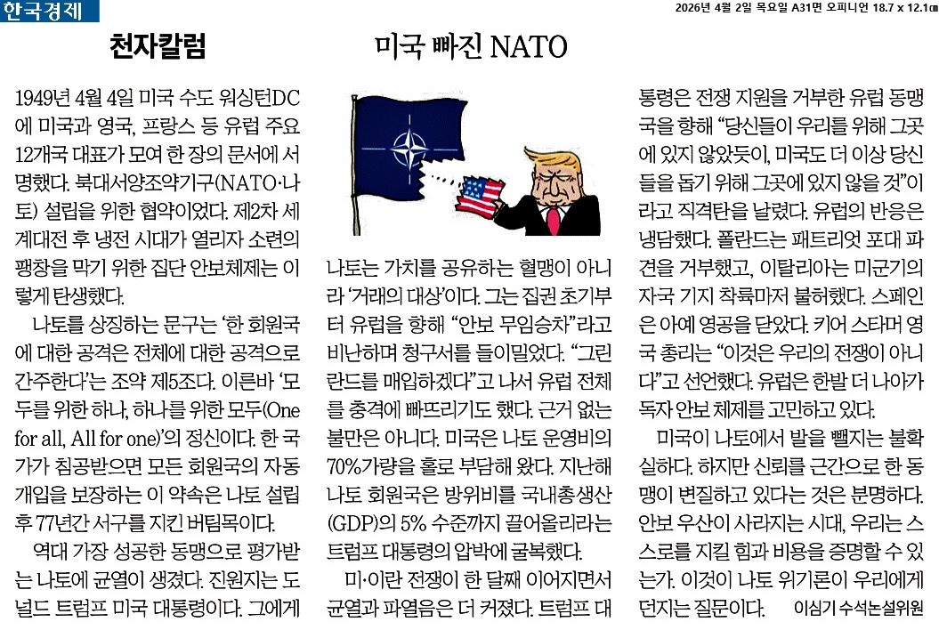 ⑤ 미국이 나토에서 발을 뺄지는 불확실하다. 하지만 신뢰를 근간으로 한 동맹이 변질하고 있다는 것은 분명하다. 안보 우산이 사라지는 시대, 우리는 스스로를 지킬 힘과 비용을 증명할 수 있는가. 이것이 나토 위기론이 우리에게 던지는 질문이다.