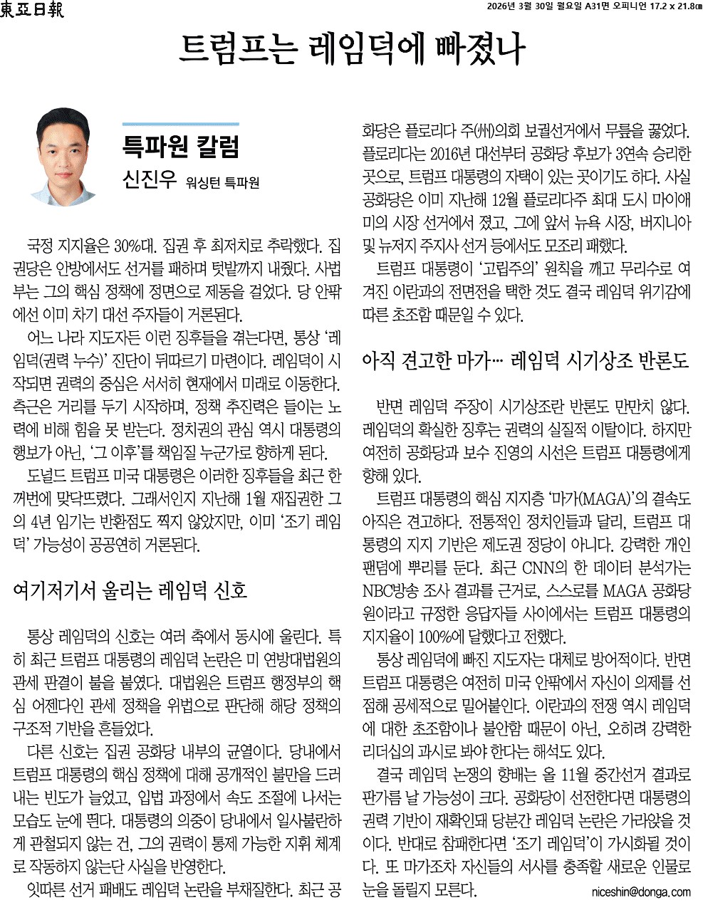 ⑤ 결국 레임덕 논쟁의 향배는 올 11월 중간선거 결과로 판가름 날 가능성이 크다. 공화당이 선전한다면 대통령의 권력 기반이 재확인돼 당분간 레임덕 논란은 가라앉을 것이다. 반대로 참패한다면 ‘조기 레임덕’이 가시화될 것이다. 또 마가조차 자신들의 서사를 충족할 새로운 인물로 눈을 돌릴지 모른다.