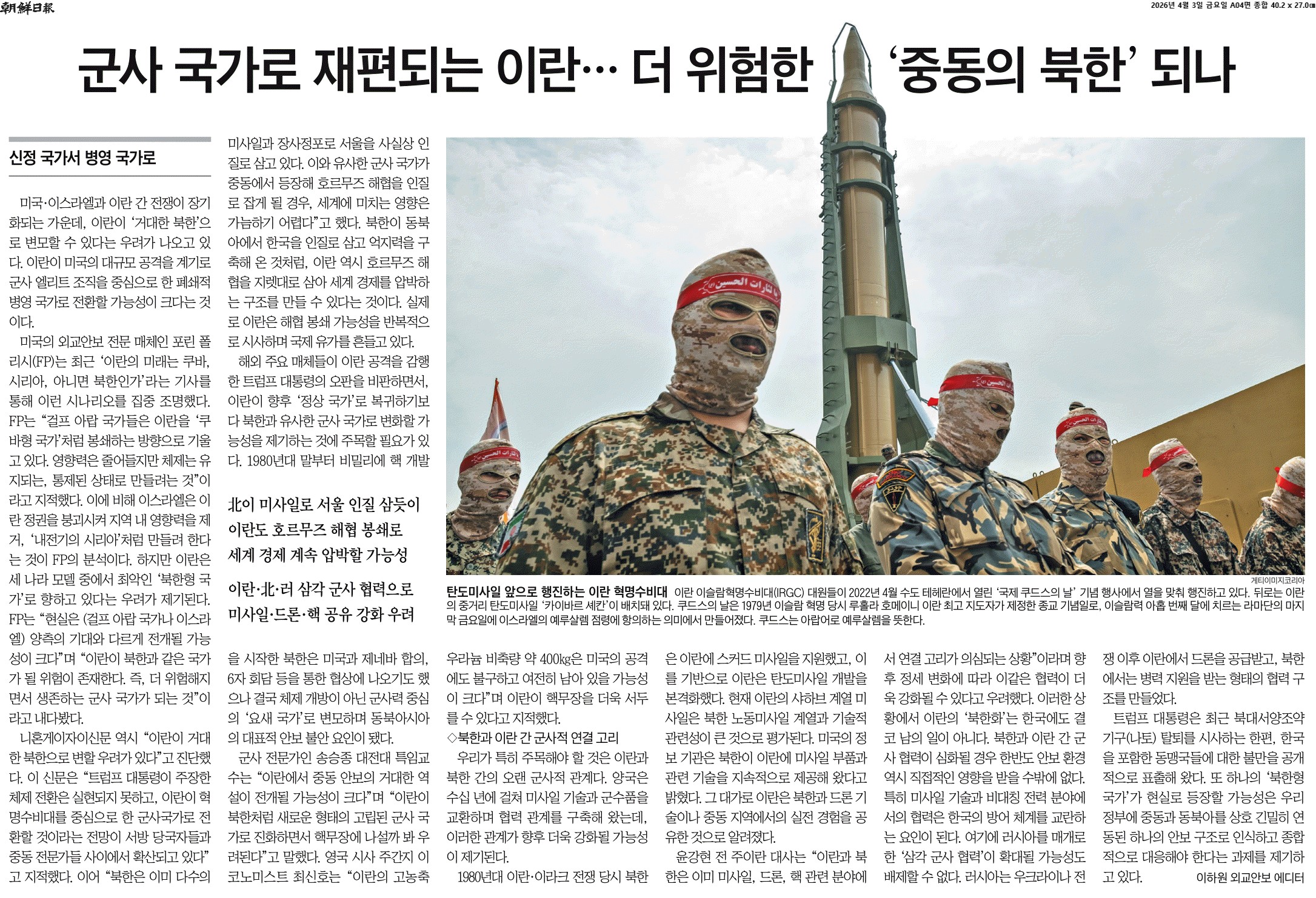 ③ 니혼게이자이신문 역시 “이란이 거대한 북한으로 변할 우려가 있다”고 진단했다. 이 신문은 “트럼프 대통령이 주장한 체제 전환은 실현되지 못하고, 이란이 혁명수비대를 중심으로 한 군사국가로 전환할 것이라는 전망이 서방 당국자들과 중동 전문가들 사이에서 확산되고 있다”고 지적했다. 이어 “북한은 이미 다수의 미사일과 장사정포로 서울을 사실상 인질로 삼고 있다. 이와 유사한 군사 국가가 중동에서 등장해 호르무즈 해협을 인질로 잡게 될 경우, 세계에 미치는 영향은 가늠하기 어렵다”고 했다.