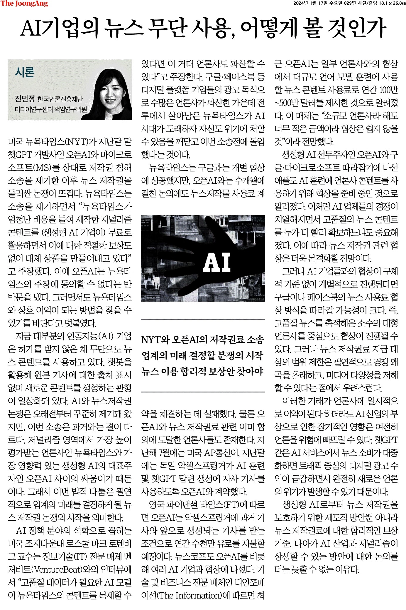 ① 미국 뉴욕타임스가 지난달 말 오픈 AI와 마이크로소프트(MS)를 상대로 저작권 침해 소송을 제기한 이후 뉴스 저작권을 둘러싼 논쟁이 뜨겁다.