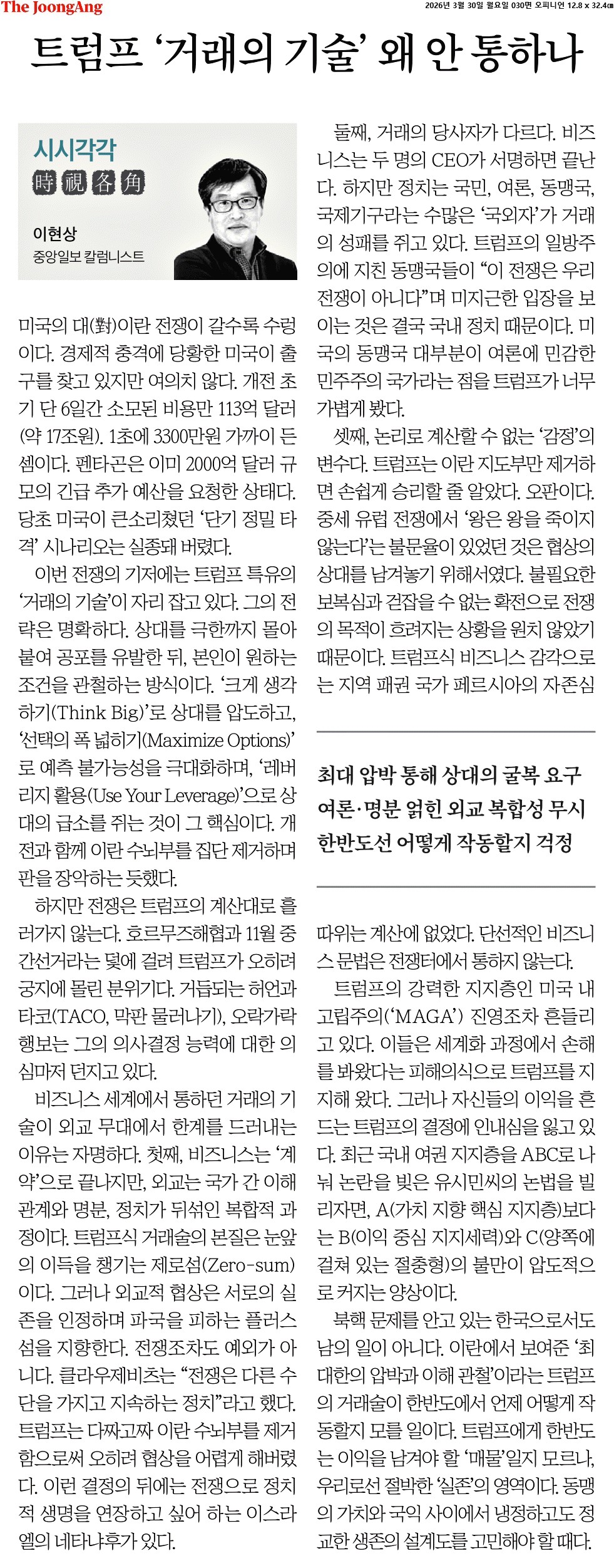 ② 이번 전쟁의 기저에는 트럼프 특유의 ‘거래의 기술’이 자리 잡고 있다. 그의 전략은 명확하다. 상대를 극한까지 몰아붙여 공포를 유발한 뒤, 본인이 원하는 조건을 관철하는 방식이다. ‘크게 생각하기(Think Big)’로 상대를 압도하고, ‘선택의 폭 넓히기(Maximize Options)’로 예측 불가능성을 극대화하며, ‘레버리지 활용(Use Your Leverage)’으로 상대의 급소를 쥐는 것이 그 핵심이다. 개전과 함께 이란 수뇌부를 집단 제거하며 판을 장악하는 듯했다.