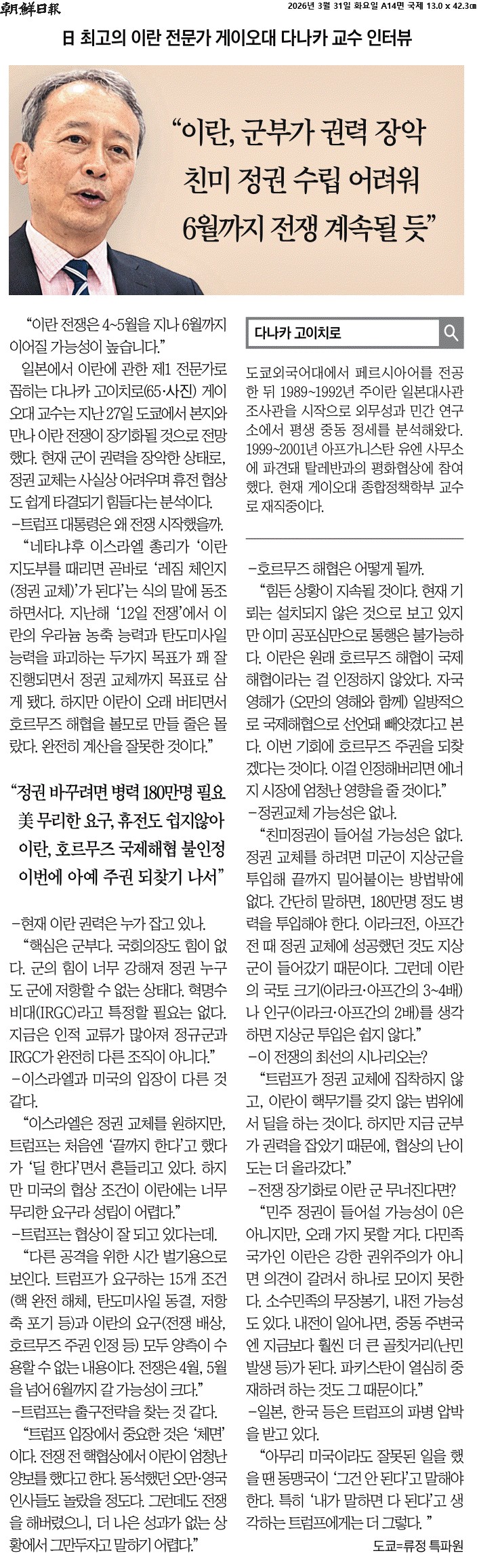 일본에서 이란에 관한 제1 전문가로 꼽히는 다나카 고이치로(65) 게이오대 교수는 지난 27일 도쿄에서 본지와 만나 이란 전쟁이 장기화될 것으로 전망했다. 현재 군이 권력을 장악한 상태로, 정권 교체는 사실상 어려우며 휴전 협상도 쉽게 타결되기 힘들다는 분석이다.