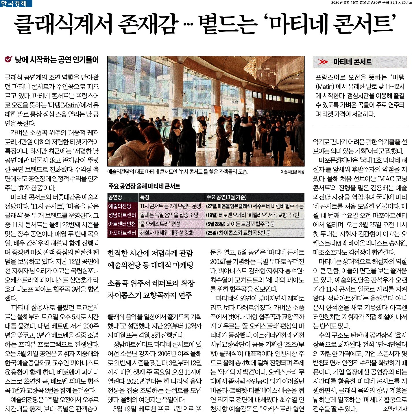 ① 클래식 공연계의 조연 역할을 맡아왔던 마티네 콘서트가 주인공으로 떠오르고 있다. 마티네 콘서트는 프랑스어로 오전을 뜻하는 ‘마탱(Matin)’에서 유래한 말로 통상 점심 즈음 열리는 낮 공연을 뜻한다.