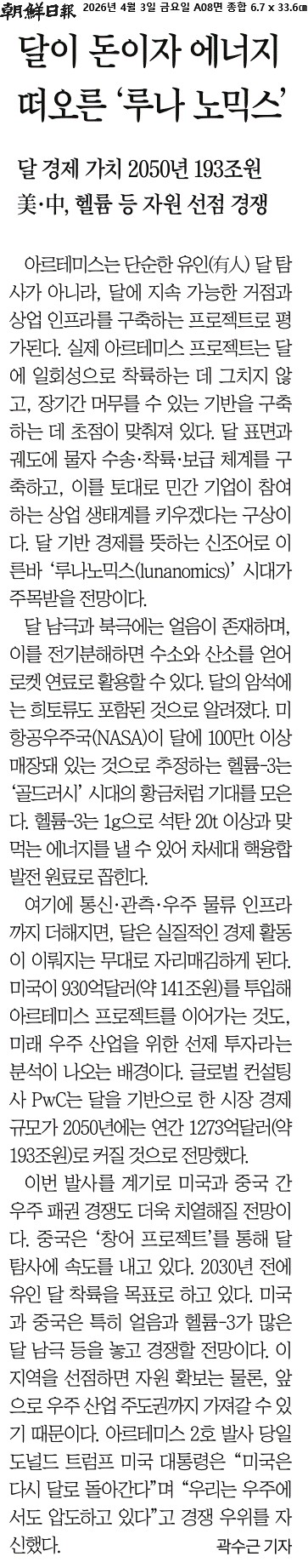 ③ 여기에 통신·관측·우주 물류 인프라까지 더해지면, 달은 실질적인 경제 활동이 이뤄지는 무대로 자리매김하게 된다. 미국이 930억달러(약 141조원)를 투입해 아르테미스 프로젝트를 이어가는 것도, 미래 우주 산업을 위한 선제 투자라는 분석이 나오는 배경이다.