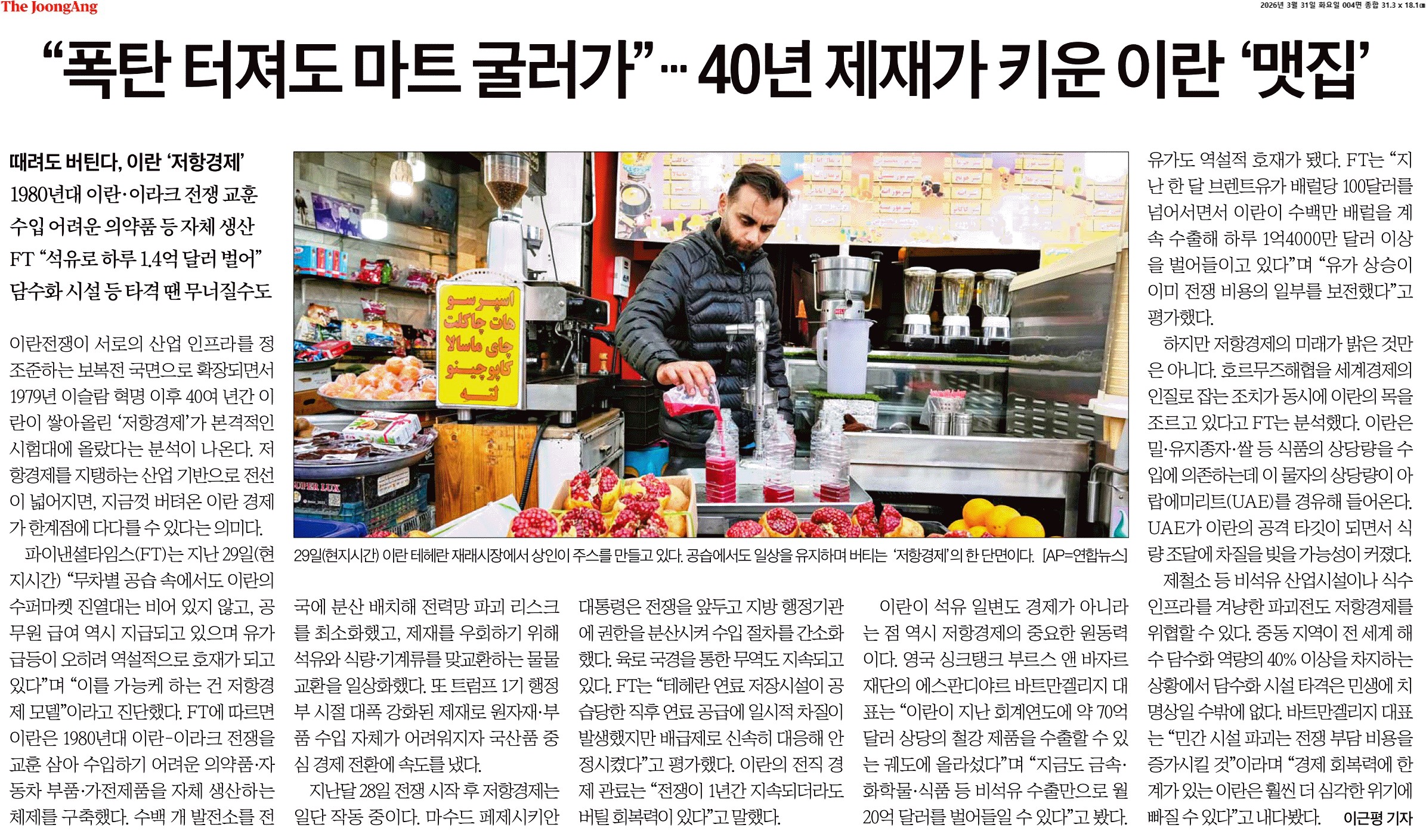② 파이낸셜타임스(FT)는 지난 29일(현지시간) “무차별 공습 속에서도 이란의 수퍼마켓 진열대는 비어 있지 않고, 공무원 급여 역시 지급되고 있으며 유가 급등이 오히려 역설적으로 호재가 되고 있다”며 “이를 가능케 하는 건 저항경제 모델”이라고 진단했다. FT에 따르면 이란은 1980년대 이란-이라크 전쟁을 교훈 삼아 수입하기 어려운 의약품·자동차 부품·가전제품을 자체 생산하는 체제를 구축했다.