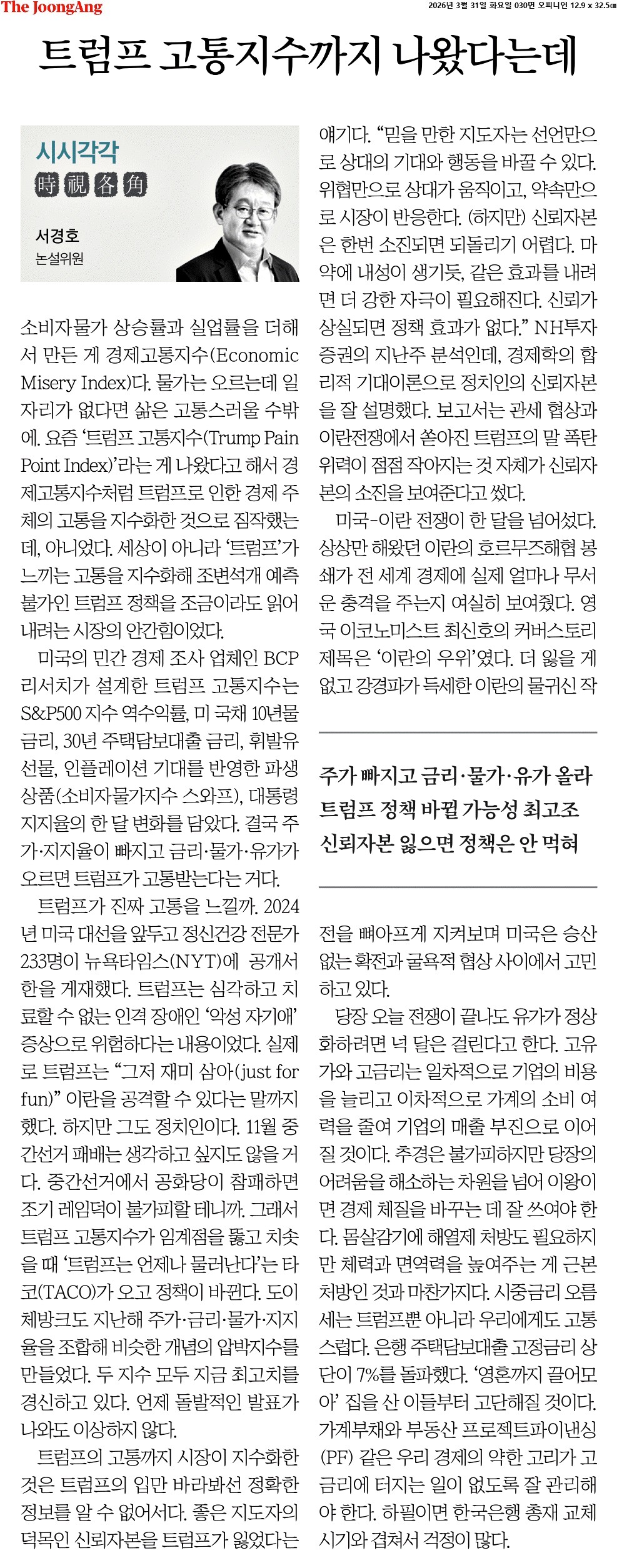 ④ 트럼프의 고통까지 시장이 지수화한 것은 트럼프의 입만 바라봐선 정확한 정보를 알 수 없어서다. 좋은 지도자의 덕목인 신뢰자본을 트럼프가 잃었다는 얘기다. “믿을 만한 지도자는 선언만으로 상대의 기대와 행동을 바꿀 수 있다. 위협만으로 상대가 움직이고, 약속만으로 시장이 반응한다. (하지만) 신뢰자본은 한번 소진되면 되돌리기 어렵다. 마약에 내성이 생기듯, 같은 효과를 내려면 더 강한 자극이 필요해진다. 신뢰가 상실되면 정책 효과가 없다.” NH투자증권의 지난주 분석인데, 경제학의 합리적 기대이론으로 정치인의 신뢰자본을 잘 설명했다. 보고서는 관세 협상과 이란전쟁에서 쏟아진 트럼프의 말 폭탄 위력이 점점 작아지는 것 자체가 신뢰자본의 소진을 보여준다고 썼다.