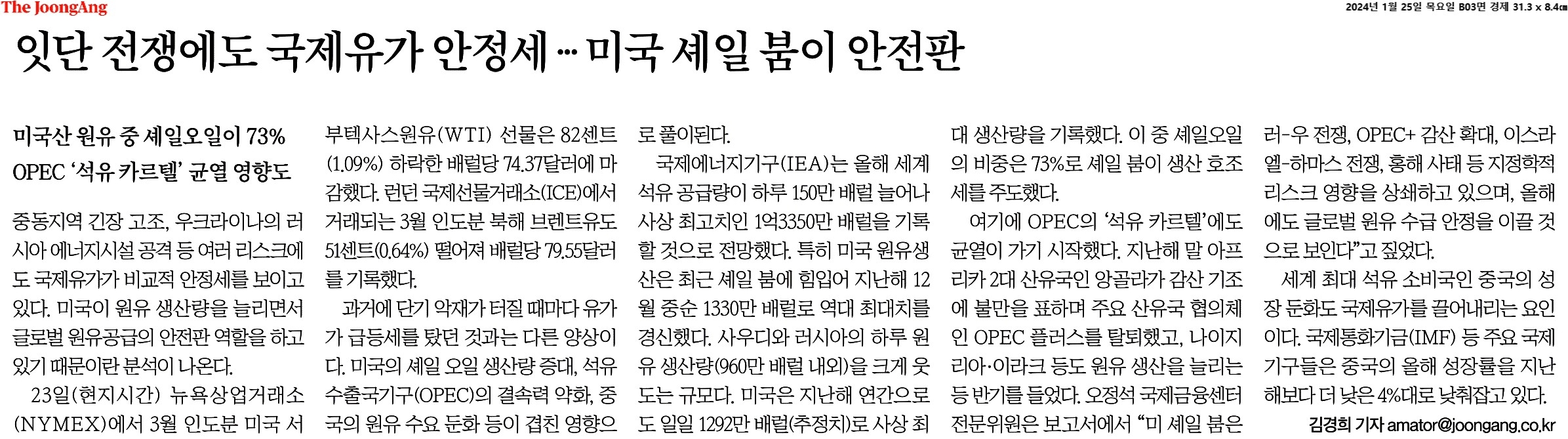 ④ "미 셰일 붐은 러-우 전쟁, OPEC+감산 확대, 이스라일-하마스 전쟁, 홍해 사태 등 지정학적 리스크 영향을 상쇄하고 있으며, 올해에도 글로벌 원유 수급 안정을 이끌 것으로 보인다"고 짚었다.
