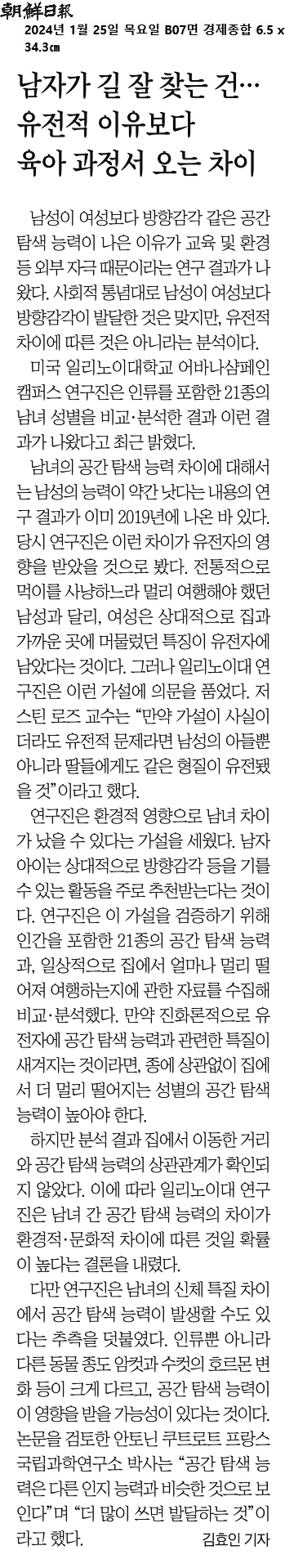 ① 남성이 여성보다 방향감각 같은 공간 탐색 능력이 나은 이유가 교육 및 환경 등 외부 자극 때문이라는 연구 결과가 나왔다.