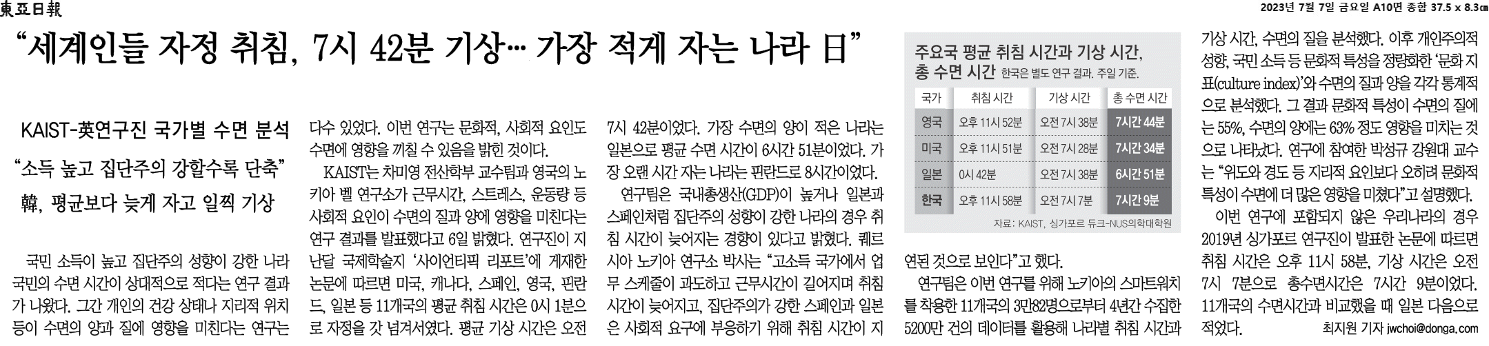 ② 11개국 평균 취침 시간은 0시1분, 평균 기상 시간은 오전 7시42분. 가장 수면의 양이 적은 나라는 일본으로 평균 수면 시간이 6시간 51분, 반면 가장 오랜 시간 자는 나라는 핀란드로 8시간이었다.