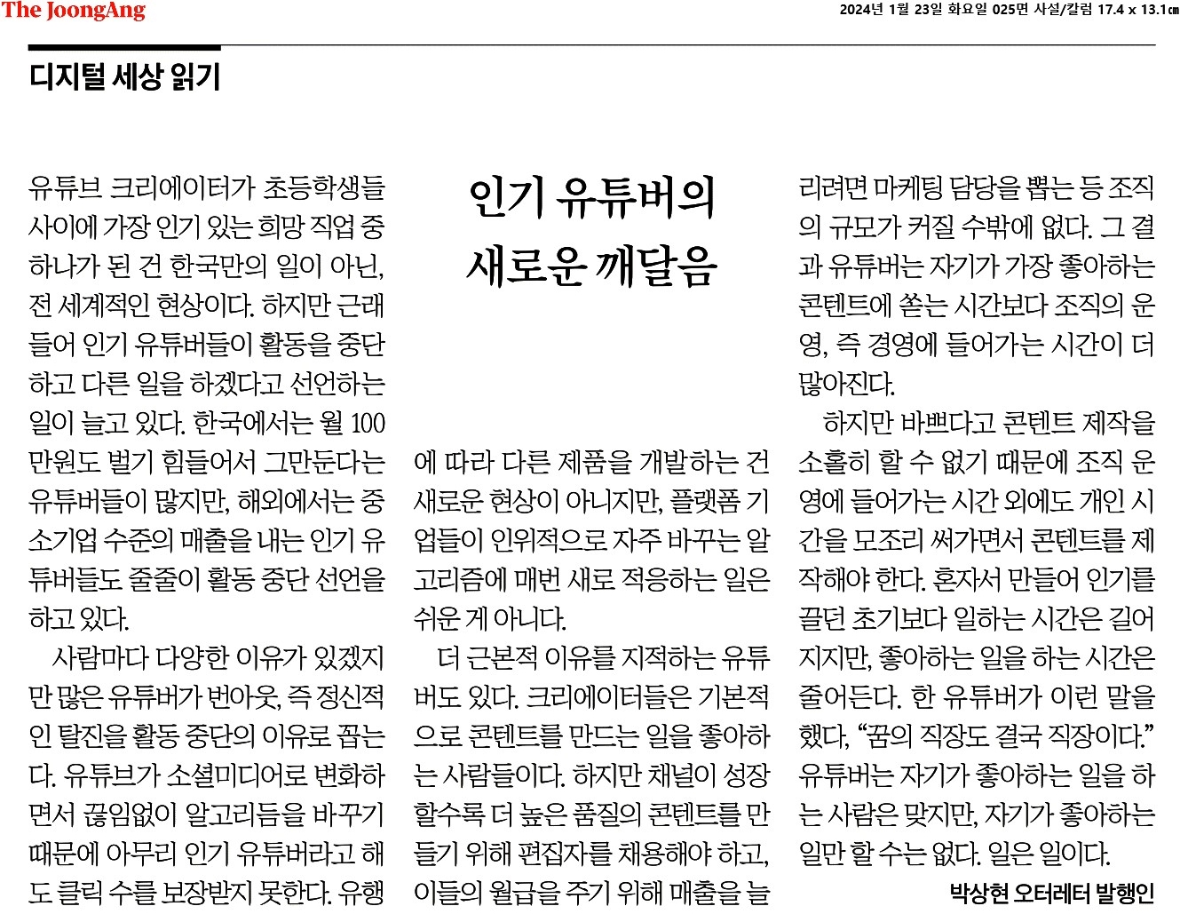 ③ 그 결과 유튜버는 자기가 좋아하는 콘텐츠에 쏟는 시간보다 조직의 운영, 즉 경영에 들어가는 시간이 더 많아진다.