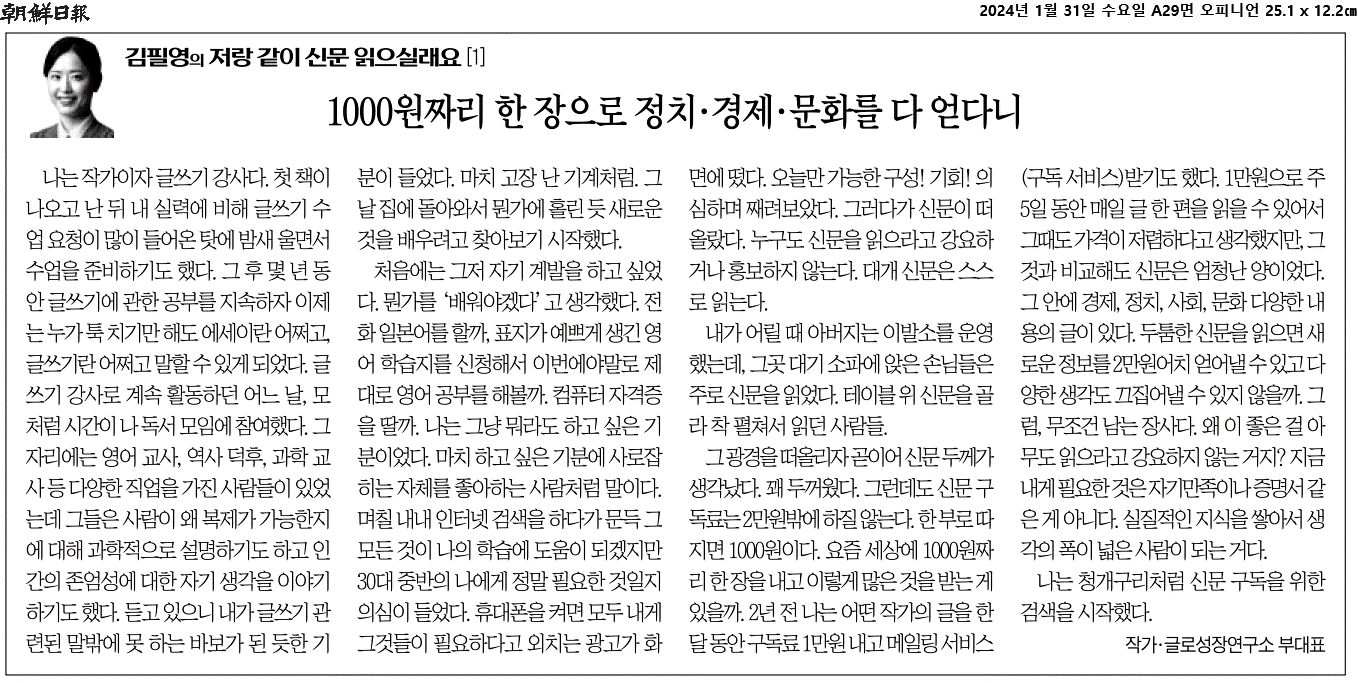 ② 신문 구독료는 2만원밖에 하질 않는다. 한 부로 따지면 1000원이다.