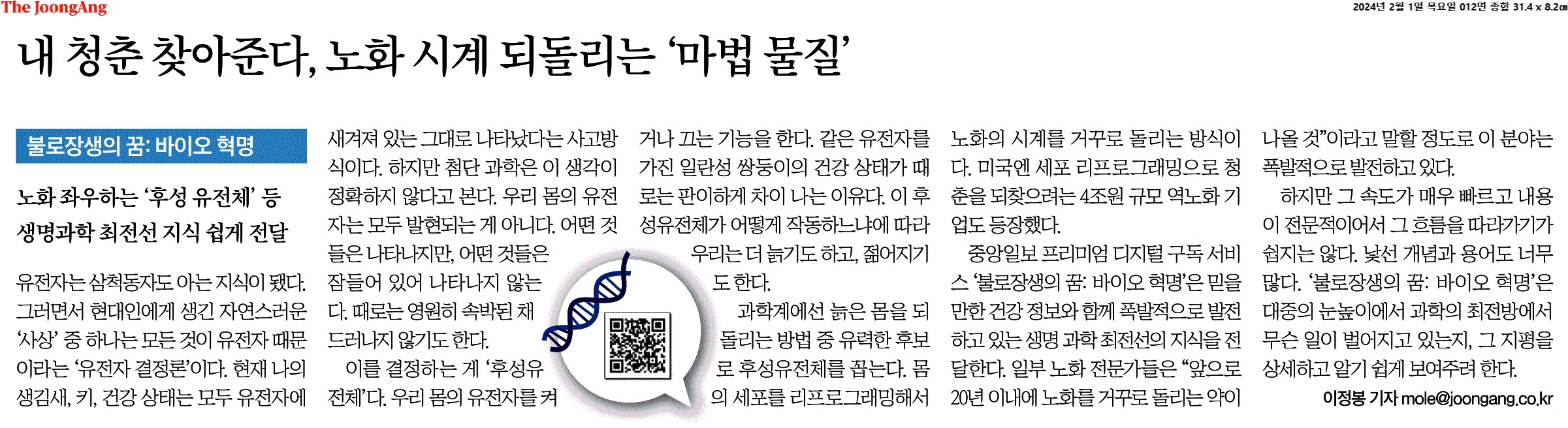 ④ 과학계에선 늙은 몸을 되돌리는 방법 중 유력한 후보로 후성유전체를 꼽는다. 몸의 세포를 리프로그래밍해서 노화의 시계를 거꾸로 돌리는 방식이다.