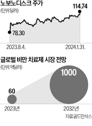 ① 제약사 노보노디스크와 일라이릴리가 또다시 신고가를 경신했다. 비만 치료제 열풍이 올해도 지속되면서 글로벌 주식시장에서의 존재감도 커지고 있다.