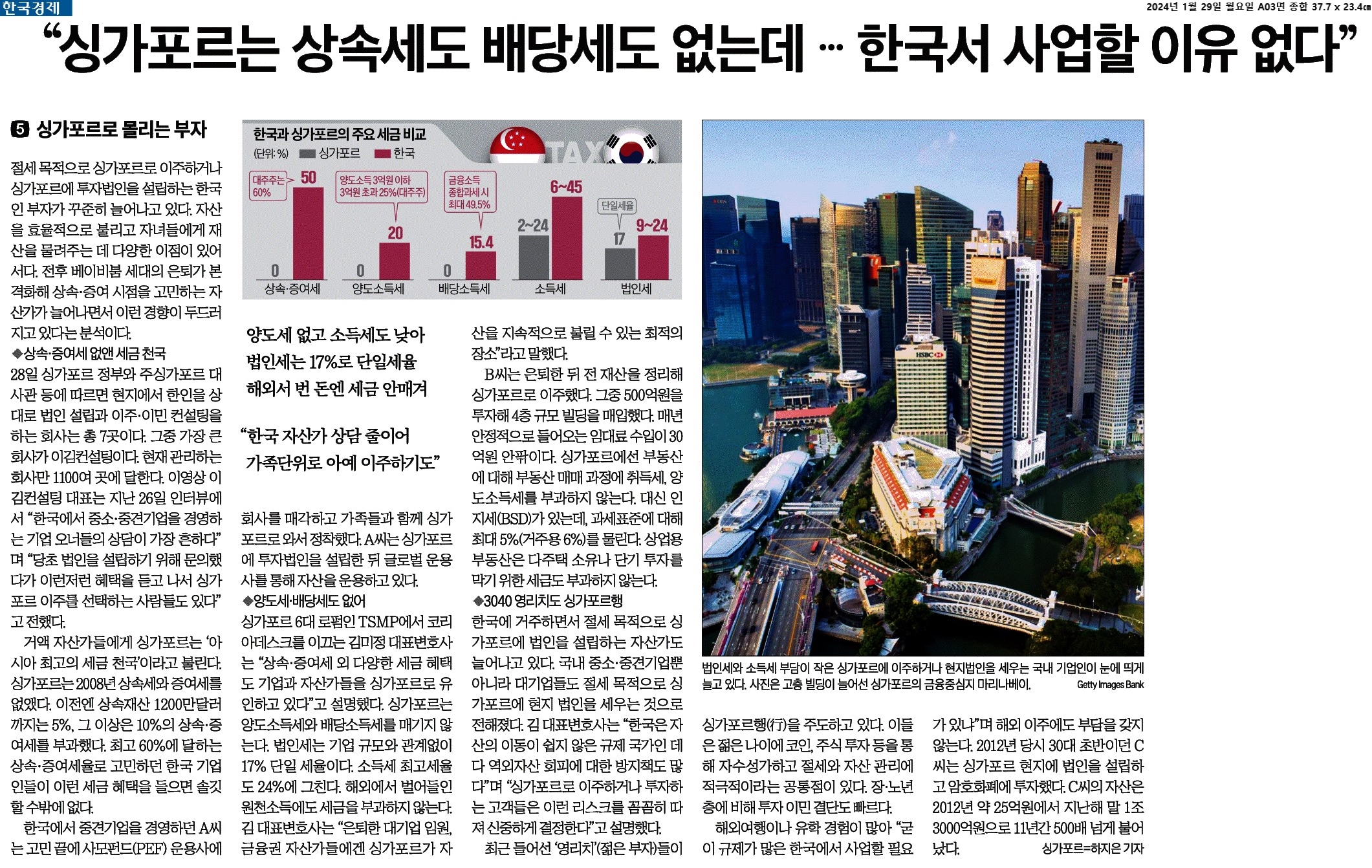 ① 절세 목적으로 싱가포르로 이주하거나 싱가포르에 투자법인을 설립하는 한국인 부자가 꾸준히 늘어나고 있다. 자산을 효율적으로 불리고 자녀들에게 재산을 물려주는 데 다양한 이점이 있어서다.