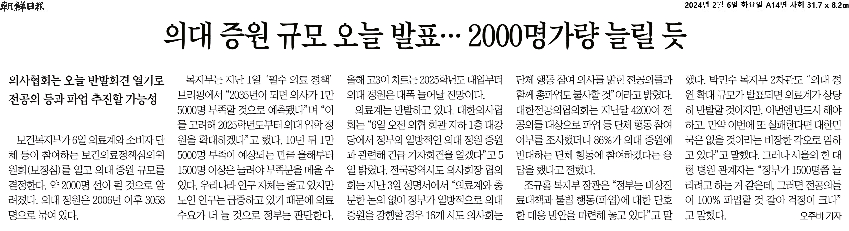 ③ "의료계와 충분한 논의 없이 정부가 일방적으로 의대 증원을 강행할 경우 16개 시도 의사회는 단체 행동 참여 의사를 밝힌 전공의들과 함께 총파업도 불사할 것"
