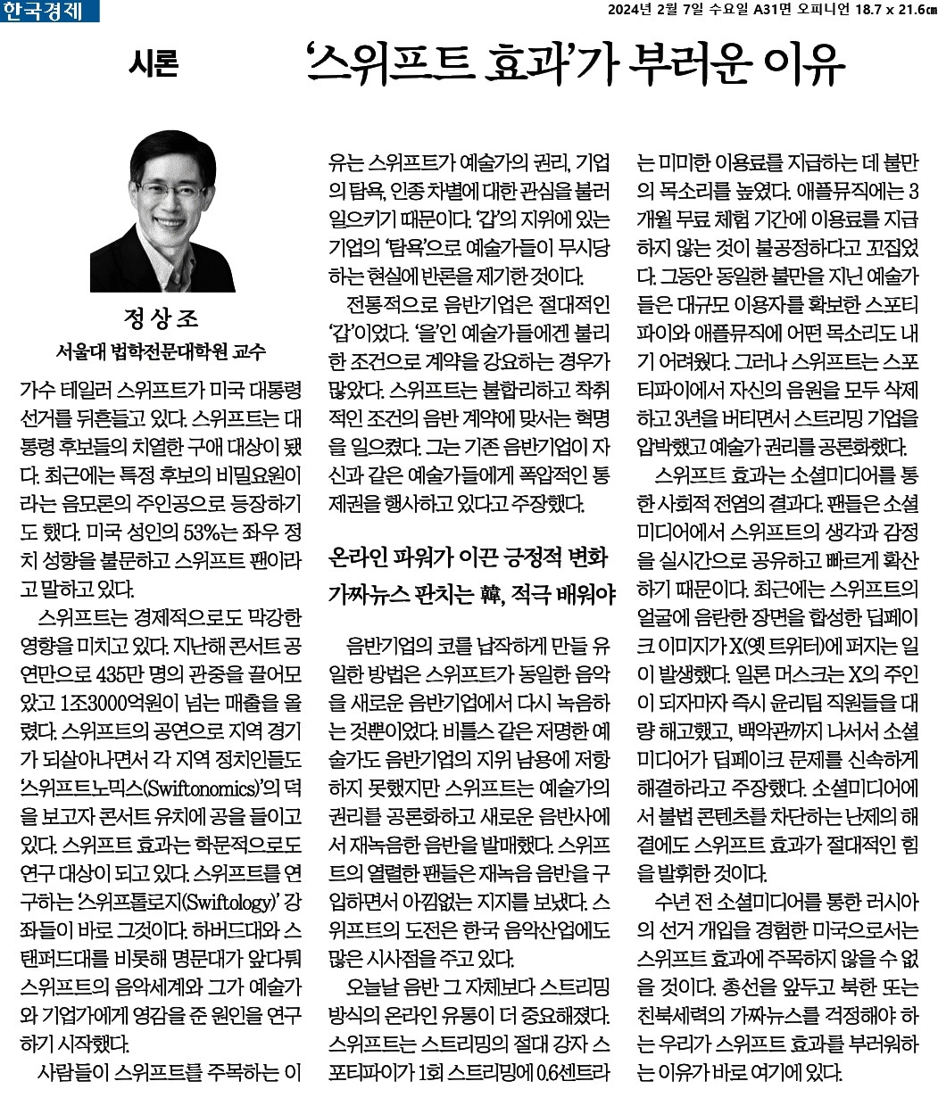④ 오늘날 음반 그 자체보다 스트리밍 방식의 온라인 유통이 더 중요해졌다. 스위프트 효과는 소셜미디어를 통한 사회적 전염의 결과다.