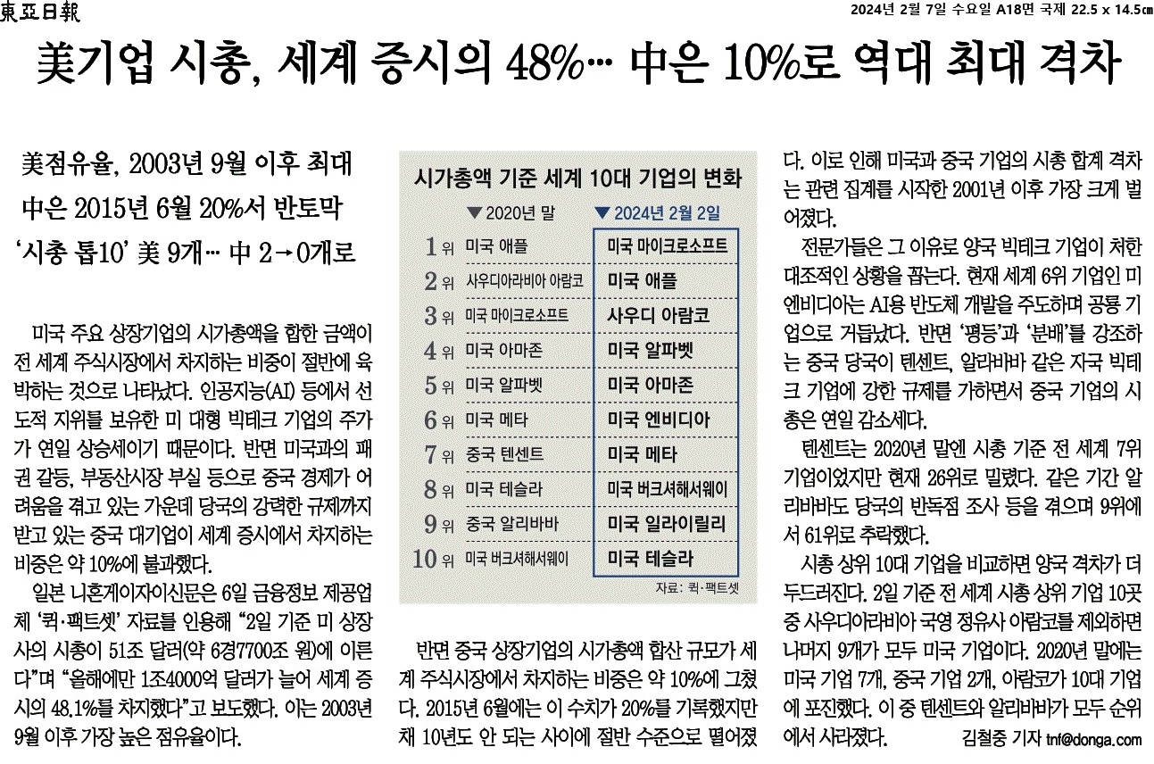 ② 세계 전체 시가총액에서 차지하는 비중은 48%로 2015년 6월말(30% 후반)과 비교했을 때 10%포인트 정도 상승했다. 2003년 9월 이후 최고 수준이다. 이에 따라 세계 증시에서 중국의 점유율은 2015년 6월 20%에서 최근 10%로 반 토막 났다.