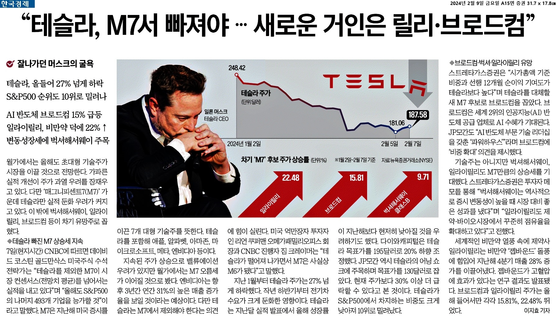 ① ‘매그니피센트7(M7)’ 가운데 테슬라만 실적 둔화 우려가 커지고 있다. 이 밖에 벅셔해서웨이, 일라이릴리, 브로드컴 등이 차기 유망주로 꼽혔다.