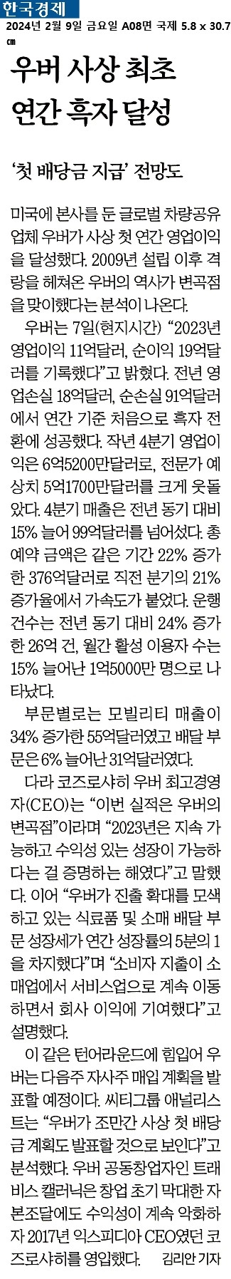 ② 우버는 7일(현지시간) “2023년 영업이익 11억달러, 순이익 19억달러를 기록했다”고 밝혔다. 전년 영업손실 18억달러, 순손실 91억달러에서 연간 기준 처음으로 흑자 전환에 성공했다.