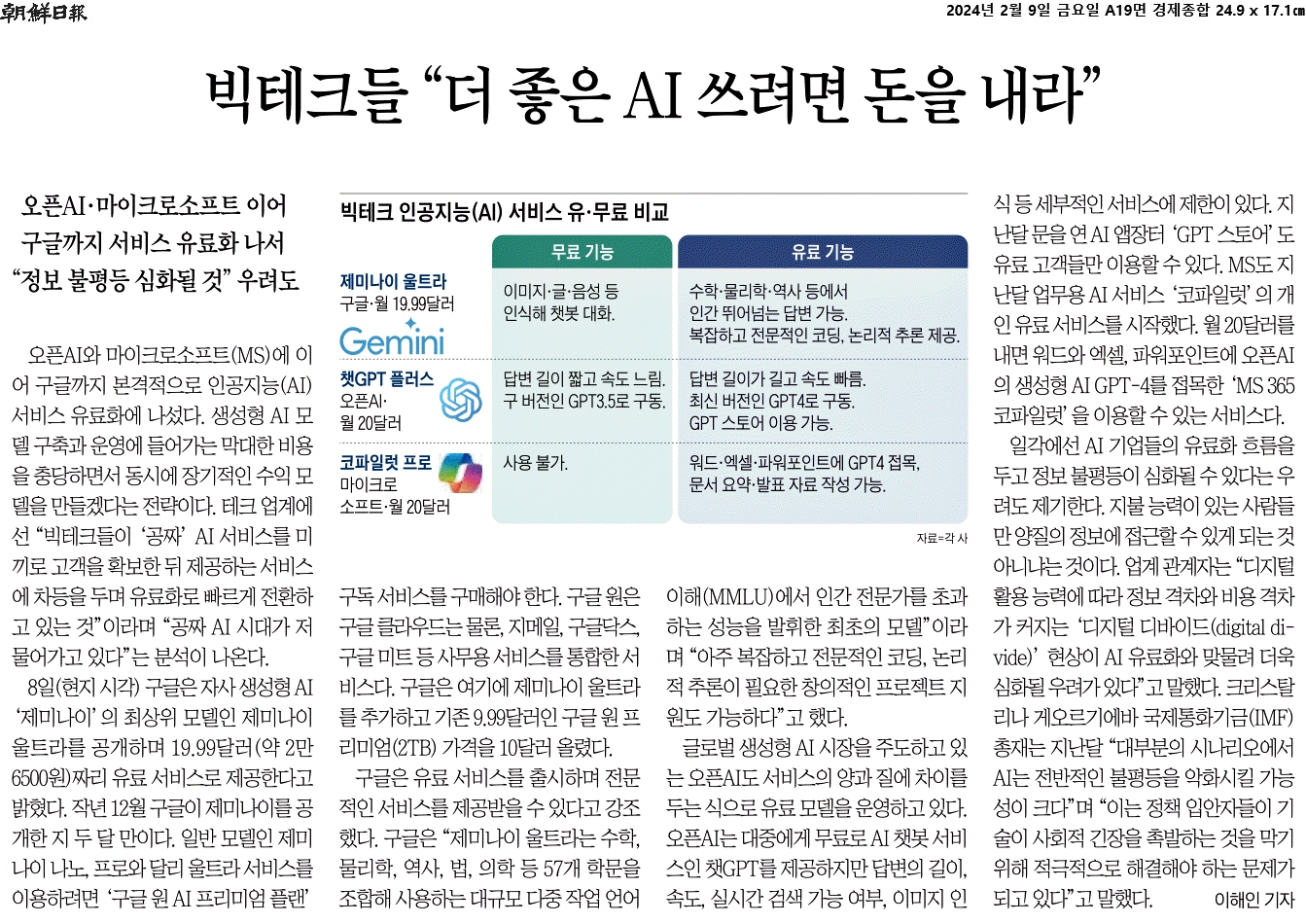 ② 테크 업계에선 “빅테크들이 ‘공짜’ AI 서비스를 미끼로 고객을 확보한 뒤 제공하는 서비스에 차등을 두며 유료화로 빠르게 전환하고 있는 것”이라며 “공짜 AI 시대가 저물어가고 있다”는 분석이 나온다.