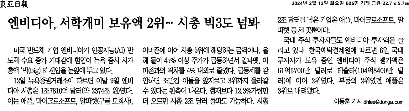① 미국 반도체 기업 엔비디아가 인공지능(AI) 반도체 수요 증가 기대감에 힘입어 뉴욕 증시 시가총액 ‘빅(big) 3’ 진입을 눈앞에 두고 있다.