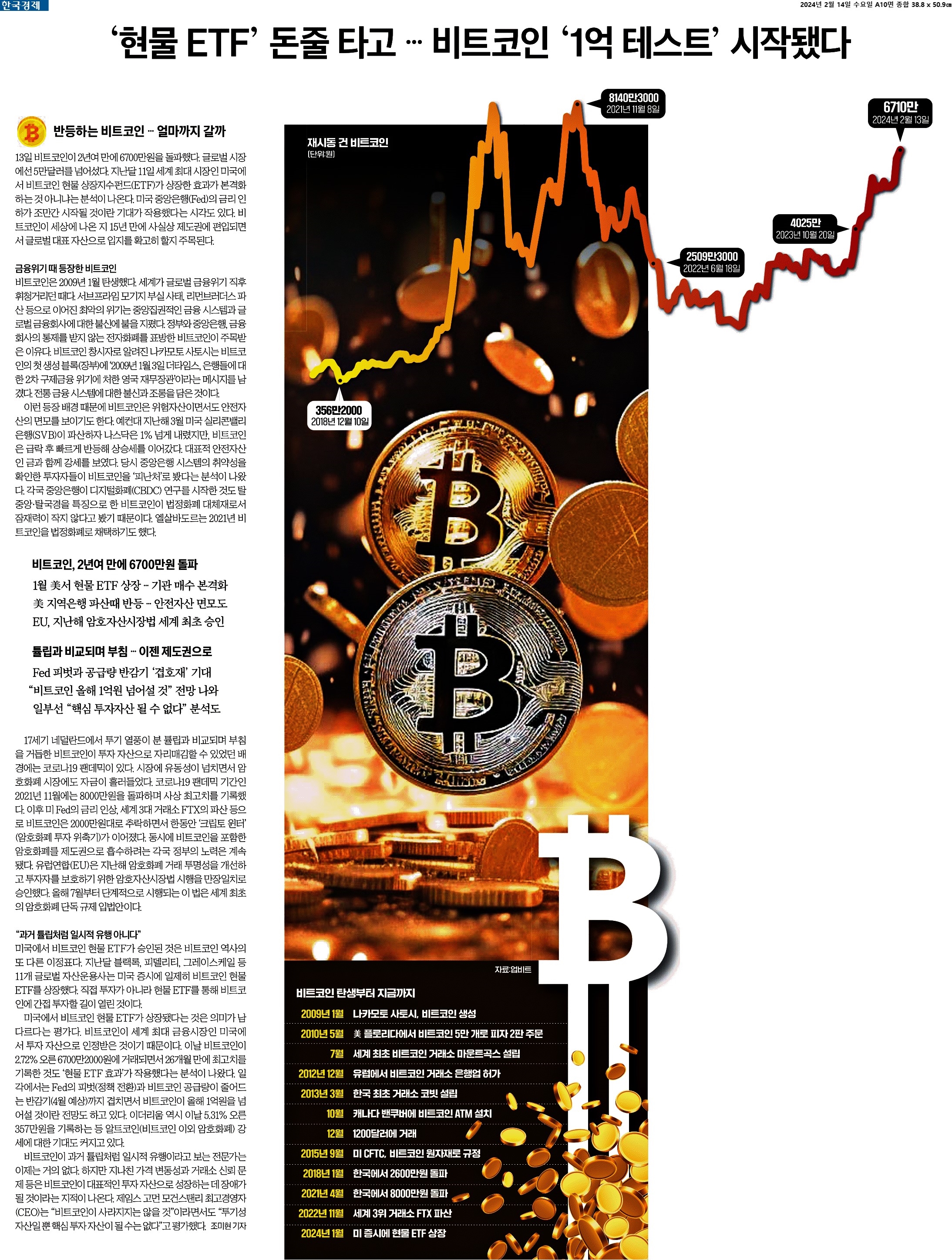 ① 13일 비트코인이 2년여 만에 6700만원을 돌파했다. 글로벌 시장에선 5만달러를 넘어섰다. 지난달 11일 세계 최대 시장인 미국에서 비트코인 현물 상장지수펀드(ETF)가 상장한 효과가 본격화하는 것 아니냐는 분석이 나온다. 미국 중앙은행(Fed)의 금리 인하가 조만간 시작될 것이란 기대가 작용했다는 시각도 있다.