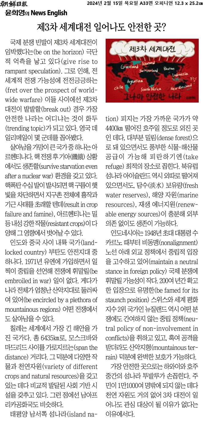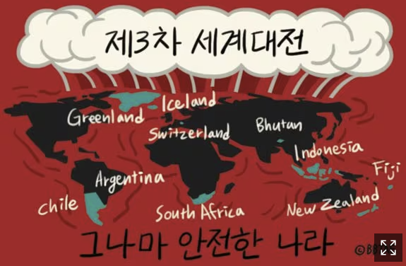 ① 전 세계적 전쟁 가능성에 전전긍긍하는 이들 사이에선 제3차 대전이 발발할 경우 가장 안전한 나라는 어디냐는 것이 화두가 되고 있다.