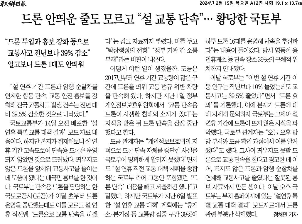 ③ 국토부는 단속용 드론을 담당하는 한국도로공사(도공)가 이달 초부터 드론 운영을 중단했는데도 이를 모르고 설 연휴 직전엔 ‘드론으로 교통 단속을 하겠다’는 경고 자료까지 뿌렸다.