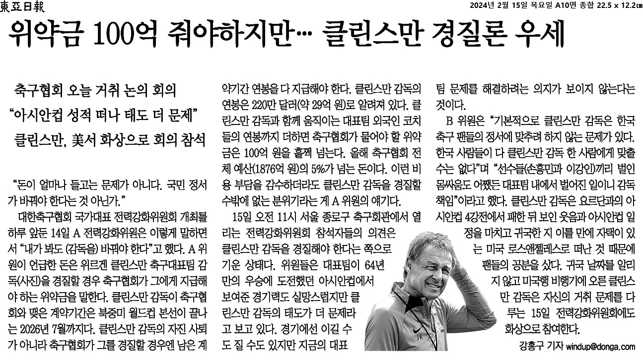 ③ 클린스만 감독의 연봉은 220만 달러(약 29억 원)로 알려져 있다. 클린스만 감독과 함께 움직이는 대표팀 외국인 코치들의 연봉까지 더하면 축구협회가 물어야 할 위약금은 100억 원을 훌쩍 넘는다.