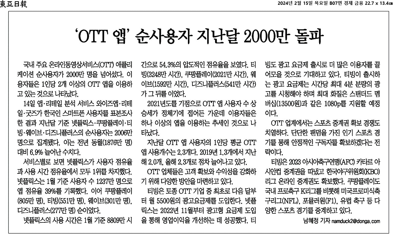 ① 국내 주요 온라인동영상서비스(OTT) 애플리케이션 순사용자가 2000만 명을 넘어섰다. 이용자들은 1인당 2개 이상의 OTT 앱을 이용하고 있는 것으로 나타났다.