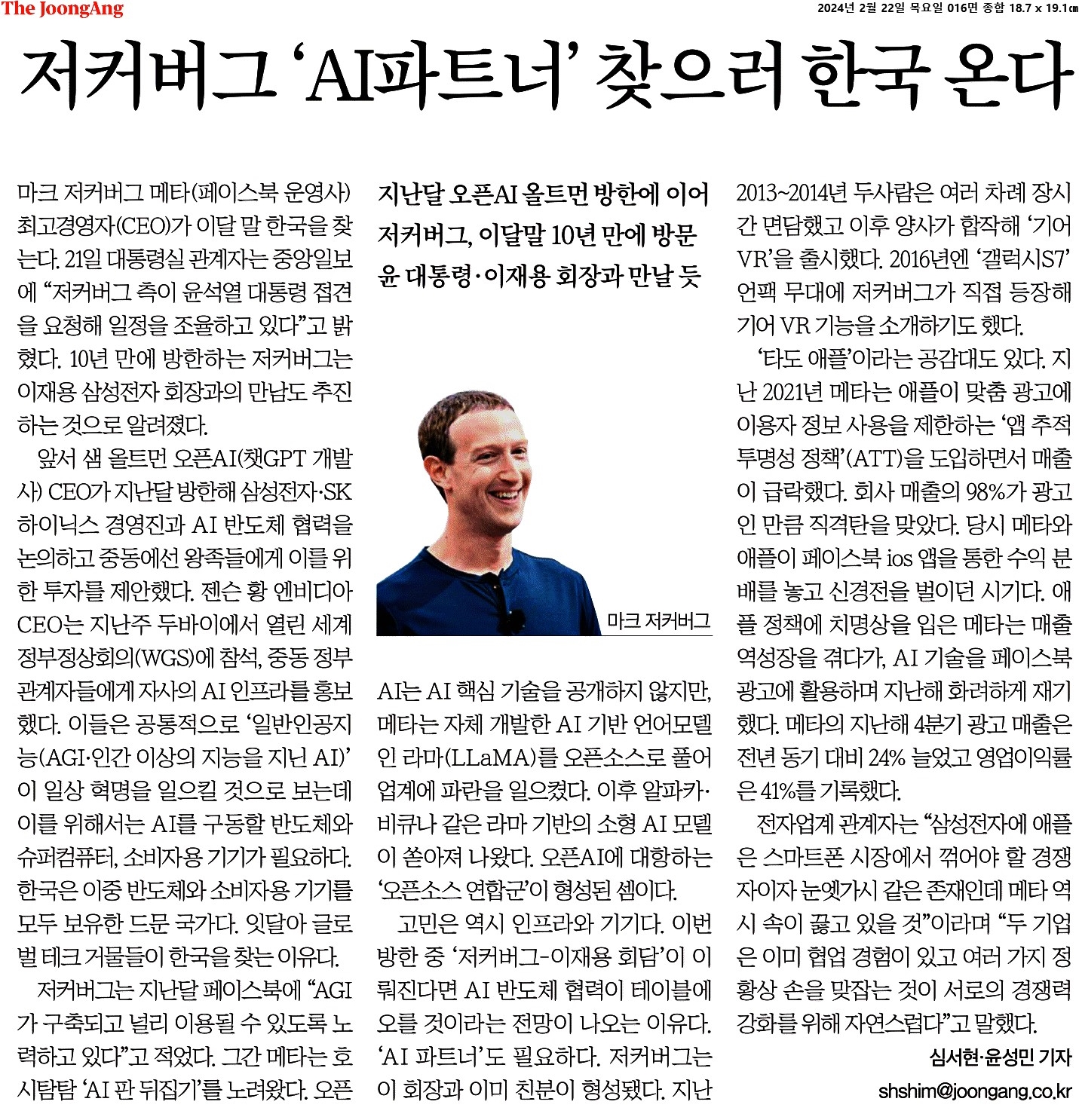 ③ 고민은 역시 인프라와 기기다. 이번 방한 중 ‘저커버그-이재용 회담’이 이뤄진다면 AI 반도체 협력이 테이블에 오를 것이라는 전망이 나오는 이유다. ‘AI 파트너’도 필요하다.