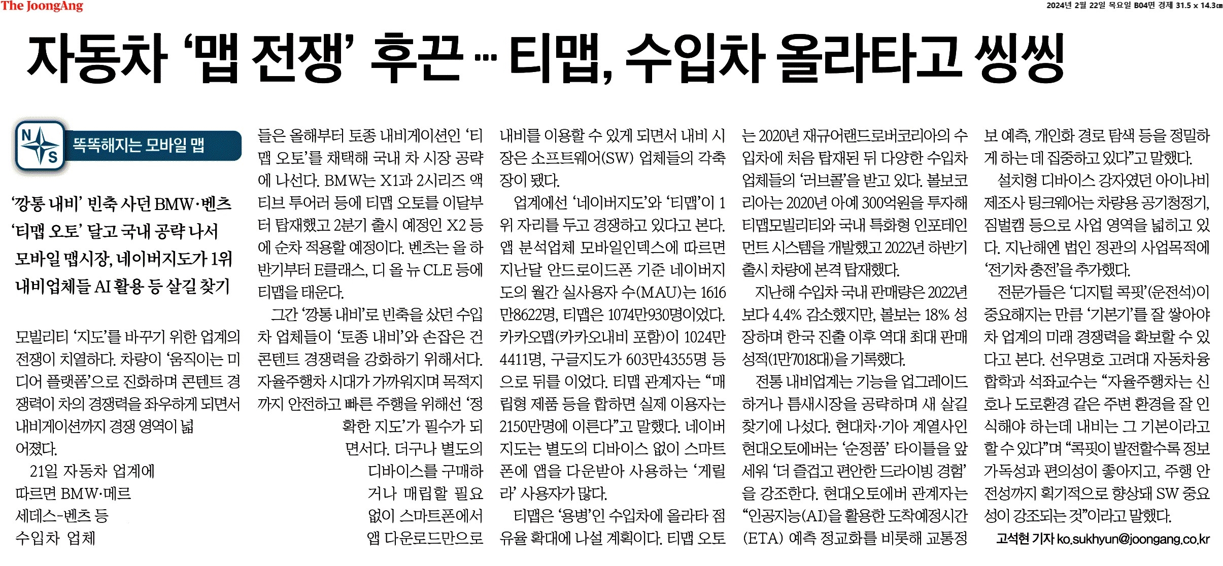 ③ 그간 ‘깡통 내비’로 빈축을 샀던 수입차 업체들이 ‘토종 내비’와 손잡은 건 콘텐트 경쟁력을 강화하기 위해서다. 자율주행차 시대가 가까워지며 목적지까지 안전하고 빠른 주행을 위해선 ‘정확한 지도’가 필수가 되면서다. 운전자들도 수백장 지도를 그대로 화면에 옮겨놓은 것 같은 내비가 아니라 실시간 교통정보 서비스를 제공하는 ‘살아있는 내비’를 선호한다.